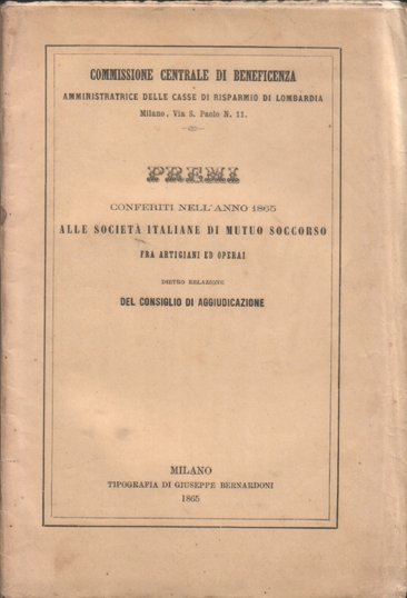 In-8°, pp. 59, (3), copertina editoriale.Le società premiate furono: la Società degli artisti ed operai di Lodi, la Società degli operai di Cremona, la Società delle operaje di Milano, la Società degli operai di Torino, la Società degli operai di Siena, la Società degli operai di Pistoia, la Società degli operai ed artisti di Rovereto, la Società degli operai di Bergamo, la Società degli operai di Brescia, la Società di mutuo soccorso di Treviglio, la Società degli operai ed artisti di Lecco, la Società patriottica degli operai di Asti, la Società degli operai di Empoli. Indice: Sessione del giorno 5 maggio 1865 della Commissione Centrale di Beneficenza; Lettera 5 maggio 1865 del Consiglio di aggiudicazione; Relazione del Consiglio di aggiudicazione dei premi; Alcune osservazioni statistiche elementari relative alle società di mutuo soccorso; Osservazioni sulla vita probabile e sulla vita media; Estratto del pocesso verbale della sessione del giorno 28 giugno 1864 della Commissione Centrale di Beneficenza; Estratto del pocesso verbale della sessione del giorno 28 giugno 1864 della Commissione Centrale di Beneficenza; Avviso di concorso ai premi; Elenco delle Società operaje di mutuo soccorso concorrenti ai premi.
