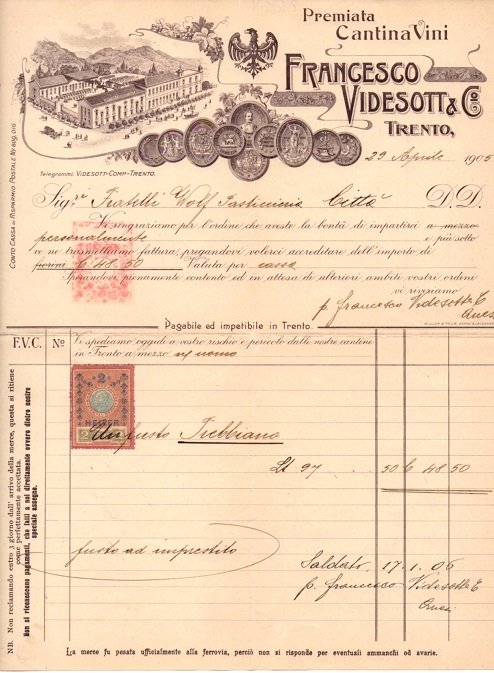 Foglio di formato 28,5x22 cm. Condizioni : USATO - Stato : Buono, ordinari segni d'uso e del tempo. Altre note : Fattura compilata nel 1905 indirizzata ai Fratelli Wolf, proprietari della pasticceria "Città ". Nelle vedutine incise la cantina, incorniciata da grappoli d'uva e dei cerchi con diversi particolari di varie città italiane.