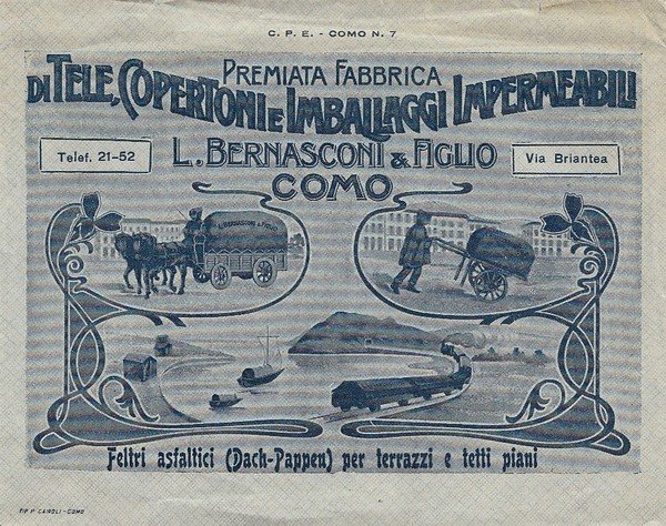 Premiata Fabbrica di Tele, Copertoni e Imballaggi Impermeabili L. Bernasconi & Figlio Como. Busta illustrata.