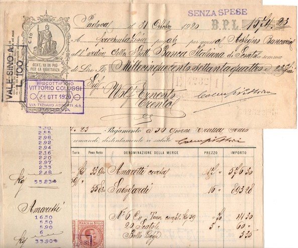Foglio filigranato di formato 28x22 cm. Condizioni : USATO - Stato : Buono, ordinari segni d'uso e del tempo. Altre note : Fattura compilata nel 1920 ed indirizzata a Trento al sig. Wolf Ernesto. Nella vedutina c'è un cerchio floreale con al suo interno una scatola, dove su una sua faccia c'è l'edificio dello stabilimento del biscottificio. Incollato alla fattura c'è un assegno sempre compilato nel 1920 ed indirizzato al sig. Wolf Ernesto. Inoltre incollato alla fattura c'è anche un biglietto con scritto tutti i prezzi dei prodotti venduti, scritti con la macchina da scrivere.