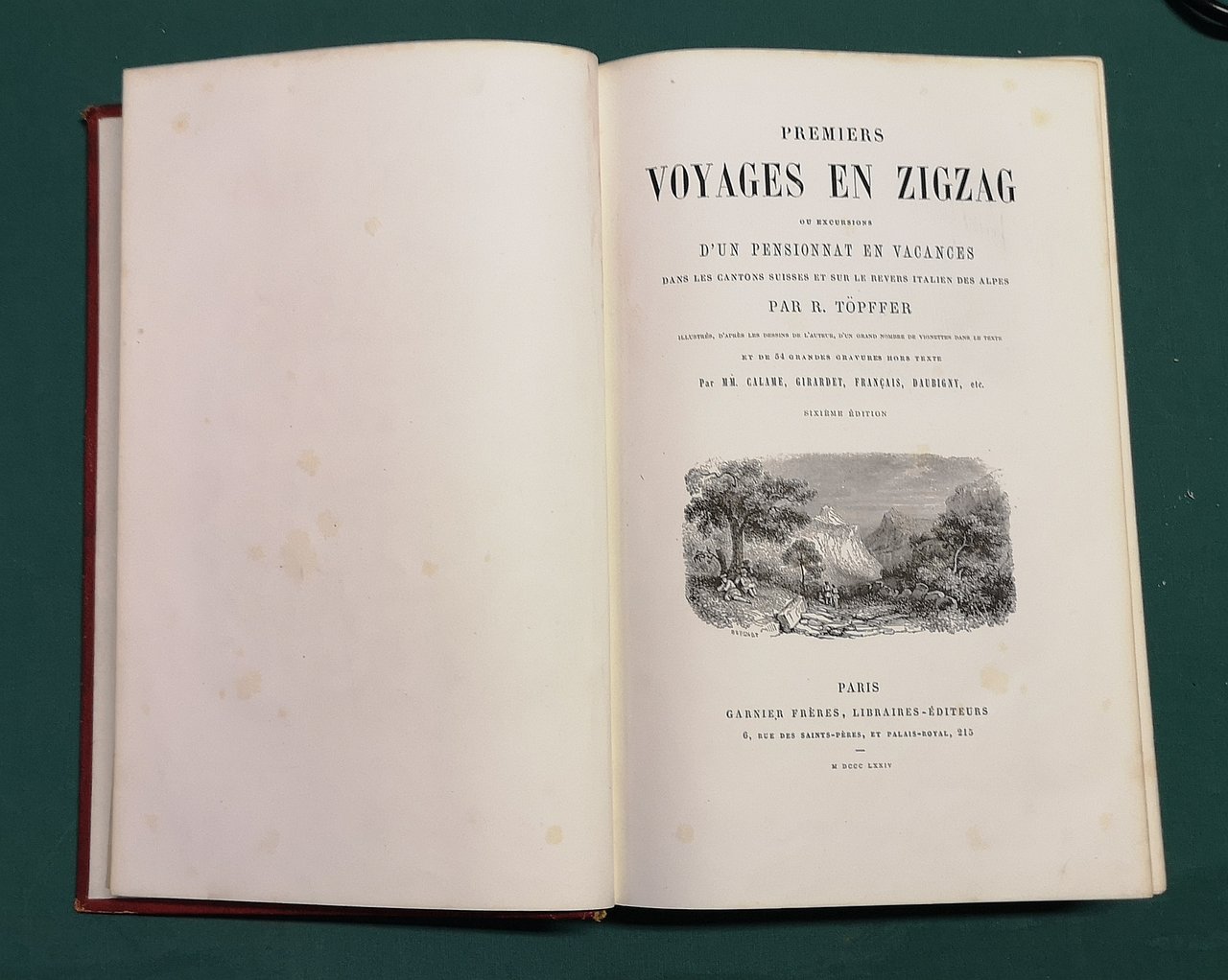 Premiers voyages en zigzag. Ou excursions d’un pensionnat en vacances dans les cantons suisses et sur le revers italiens des Alpes par R. Töpffer, illustrés d’après les dessins de l’auteur, d’un grand nombre de vignettes dans le texte et de 54 grandes gravures hors texte par MM. Calame, Girardet, Français, Daubigny, etc. Sixième édition.‎