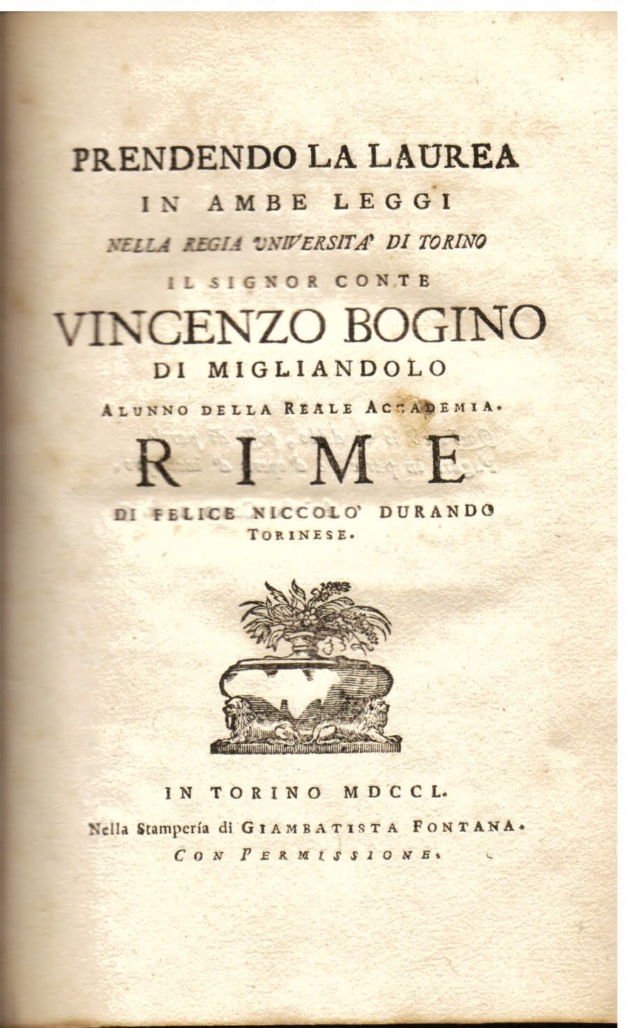 Prendendo la laurea in ambo le leggi il Conte Vincenzo Bogino . [2] Petro Josepho Graneri DD Mauritii et Lazari equiti Commendatario Juris utrisque Laurea Donato . [3] Prendendo la laurea in ambo le leggi il Marchese Gioseffo Casimiro Caissotti . [4] Prendendo la laurea in ambo le leggi il Marchese Carlo Ottaviano Massimigliano Alfieri.