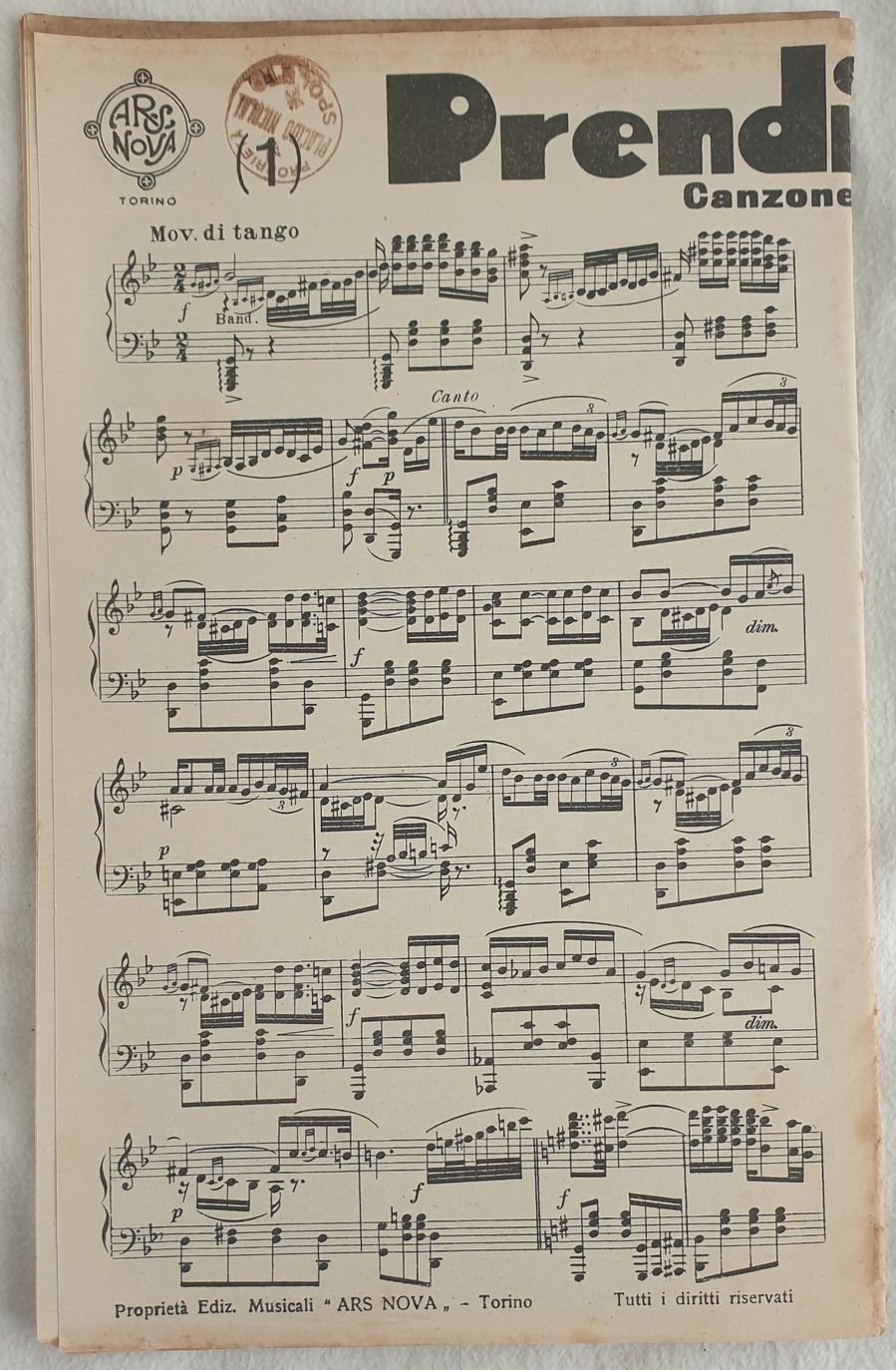 Partitura completa per orchestra del 1933 di due melodie "Prendimi." e "Addio mimì" di Leo Pant e "Mai più!." di Leo Pant Copertina assente. GENERE: Tango STRUMENTI: pianoforte; violini; viola, violoncello, flauto; tromba; trombone, batteria, contrabbasso, clarinetto, sassofono ANNO: anni 1930 DIMENSIONI: In 8. cm 27,5x17 PAGINE: pp. 28 CONDIZIONI: Buone condizioni. Copertina assente. Ex libris sulle pagine. Beautiful score of two songs of 1930's, a complete score for orchestra of the melodies "Prendimi." and "Addio mimì" di Leo Pant e "Mai più!." by Leo Pant MUSIC: Tango STRUMENTI: piano; violins; viola, violoncello, flute, trumpet, trombone, drums, contrabbass, clarinet, saxophone YEAR: 1930's SIZE: In 8. cm 27,5x17 PAGES: pp. 28 CONDITIONS: Good condition . Cover lacks NOTES: Ex libris in the pages