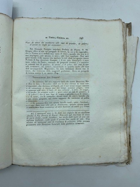In 8 (cm 22 x 28,5), pagine numerate da 343 a 346. Brossura rifatta con carta d'epoca. Stralcio dal "Giornale di Fisica, chimica e storia naturale." di L. V. Brugnatelli, tomo III, 1810, con 4 brevi articoli consecutivi: Vasi di zinco da sostituirsi alli vasi di piombo, di peltro, d'ottone negli usi economici; Preparazione di grossi turaccioli di sovero; Esame chimico del mallo delle noci; Sopra i supposti metalli degli alcali e delle terre.