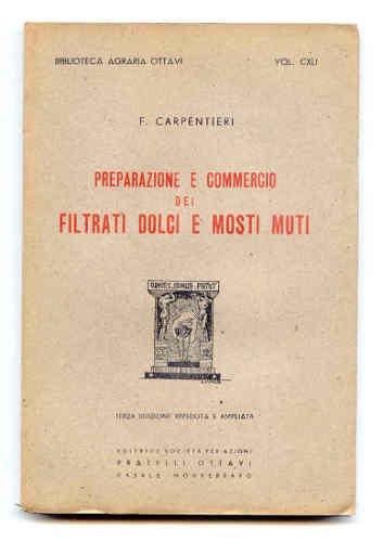 In 8vo (cm 20x13,5). Brossura originale, pag. VIII-216 con 19 illustrazioni. -- Biblioteca agraria Ottavi. Metodi di fermentazione, materiali, conservazione, impiego dei filtrati e dei mosti.