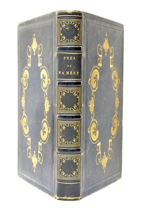 436 pages. 8 planches hors-texte. (20,5x13,5 Cm). Plein chagrin bleu foncé, richement décoré sur les plats de volutes d'or, dos à nerfs orné de caissons, tranches dorées. "A dix-sept ans, on ne sait rien de la vie que par sa mère", dit l'auteur, aussi s'en explique-t-elle: "Ces fragments tour-à-tour ont été inspirés par une fête à l'église, une promenade aux champs, l'évangile du jour, mes fleurs, mes oiseaux, une amie, un frère, par tout ce qui peut se puiser dans une existence de jeune fille…" En voici quelques titres : "Les Ruines", "Le Jour des Morts", "Ce que c'est que le Bonheur", "La Suisse" [oh! que ce nom réveille en l'âme du poète de tendres sympathies d'amour…], etc. 8 belles lithographies en coloris d'époque (signées Argentier, imprimé par Pierrat, représentent avec le charme de la naïveté quelques séquences des propos de la jeune femme, devenue sans doute institutrice et dont nous connaissons un autre ouvrage rare "Autour du feu". De fortes rousseurs affectent le texte pourtant soigneusement imprimé dans un encadrement typographique, les illustrations tirées sur un autre papier sont intactes.