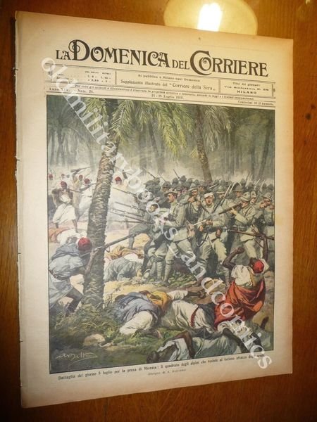 DESCRIZIONE: Domenica del Corriere, Anno 14 n. 29 (21 luglio 1912). COPERTINA: Battaglia del giorno 8 luglio per la presa di Msrata: il quadrato degli alpini che resistè al furioso attacco degli arabi. RETRO: Ore di letizia per l'Italia: entusiasmi per la bandiera italiana allo "stadium" di Stoccolma dopo il trionfo dei nostir ginnasti. CONDIZIONI: Buone, senza spillette, DA RILEGATURA, senza sovracc. azzurra. PESO / WEIGHT: 56 gr. without package
