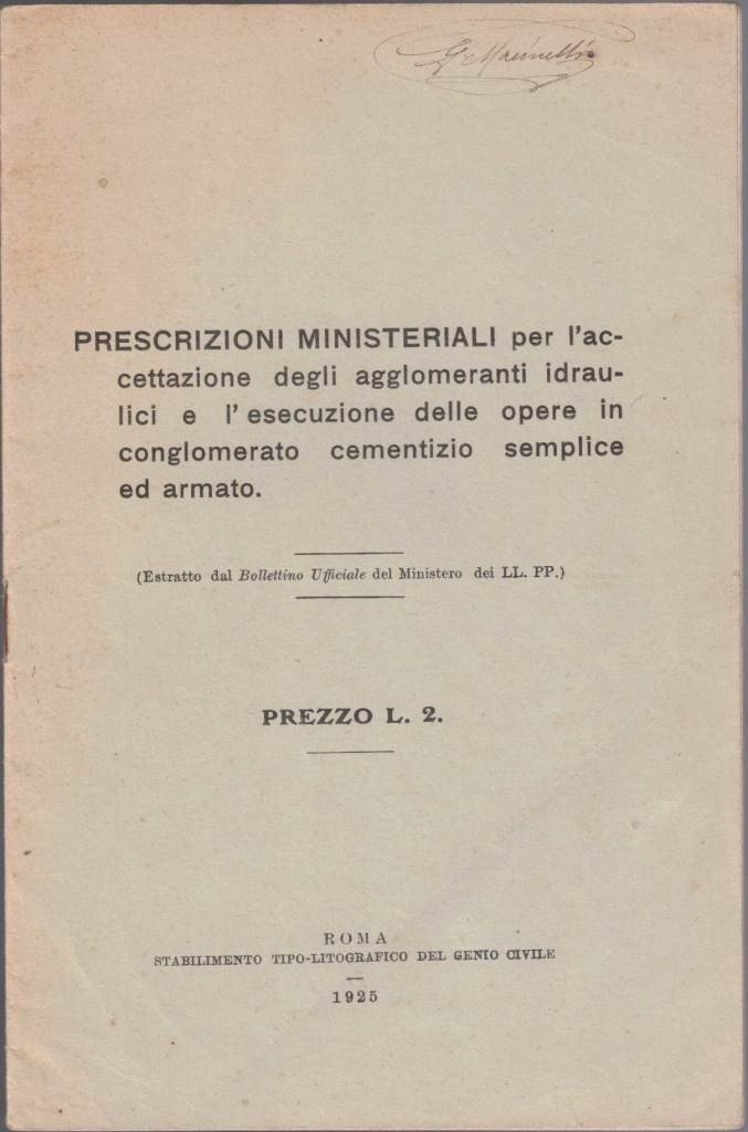 Prescrizioni ministeriali per l’accettazione degli agglomeranti idraulici e l’esecuzione delle opere in conglomerato cementizio semplice ed armato, Stabilimento Tipo-Litografico del Genio Civile, Roma 1925, pp. 31, ill. b.n., cm 23, rilegatura ed. a punto metallico. Estratto dal Bollettino Ufficiale del Ministero dei LL. PP., n. 7-8 del 1925. Firma d’appartenenza a margine della prima di copertina. Lievi tracce d’uso, minimi segni del tempo, per il resto ben conservato.