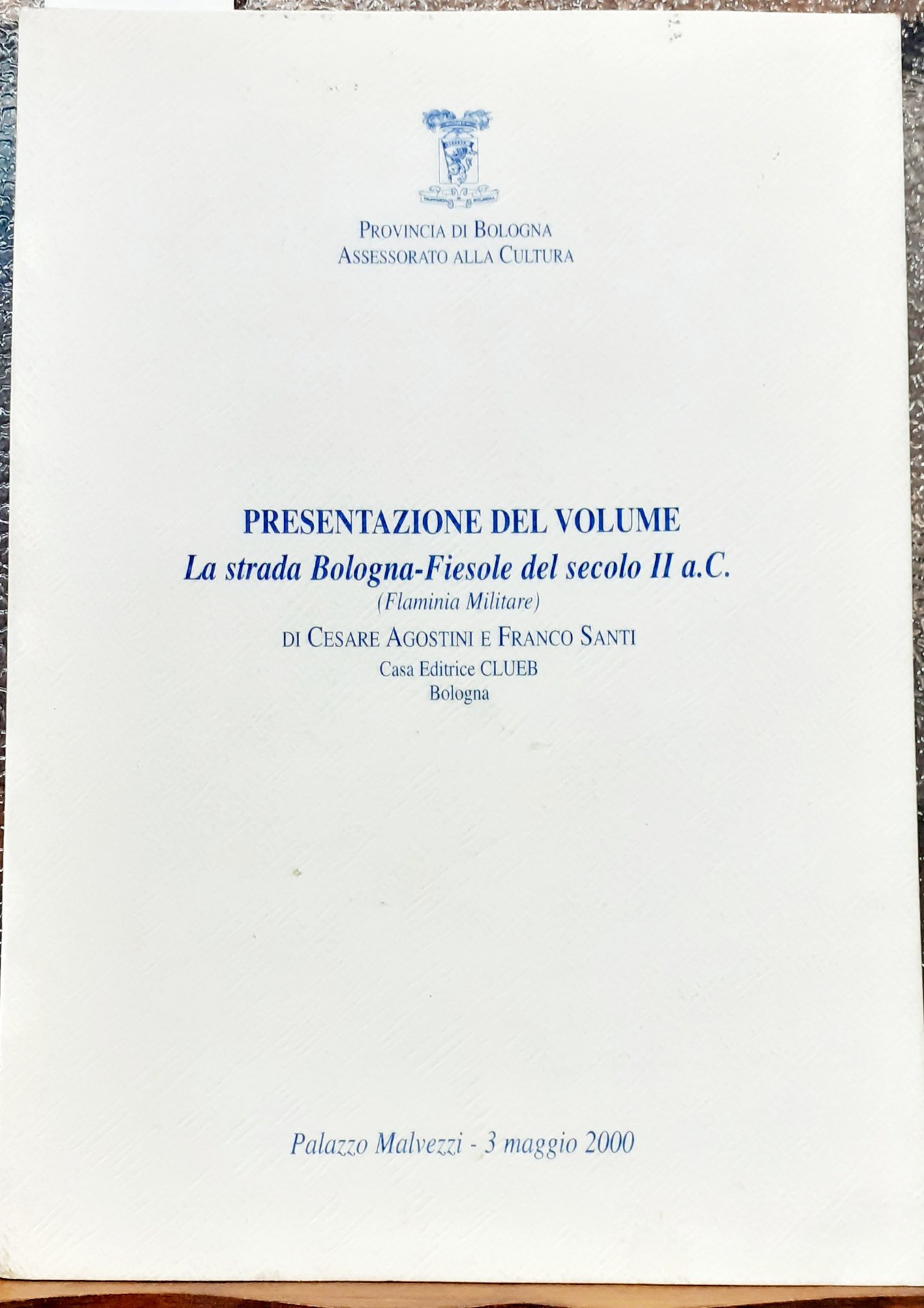 PRESENTAZIONE DEL VOLUME "LA STRADA BOLOGNA-FIESOLE DEL SECOLO II A. C. (FLAMINIA MILITARE)" di CESARE AGOSTINI e FRANCO SANTI. Palazzo Malvezzi, 3 maggio 2000.