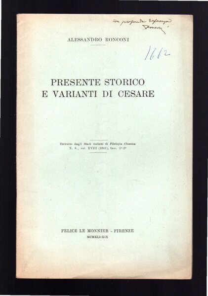 Opuscolo vintage. Estratto dagli Studi italiani di Filologia classica N. S., vol. XVIII (1941), fasc. I-II. Segni di biro in copertina. Piega centrale. Ordinario segno del tempo.
