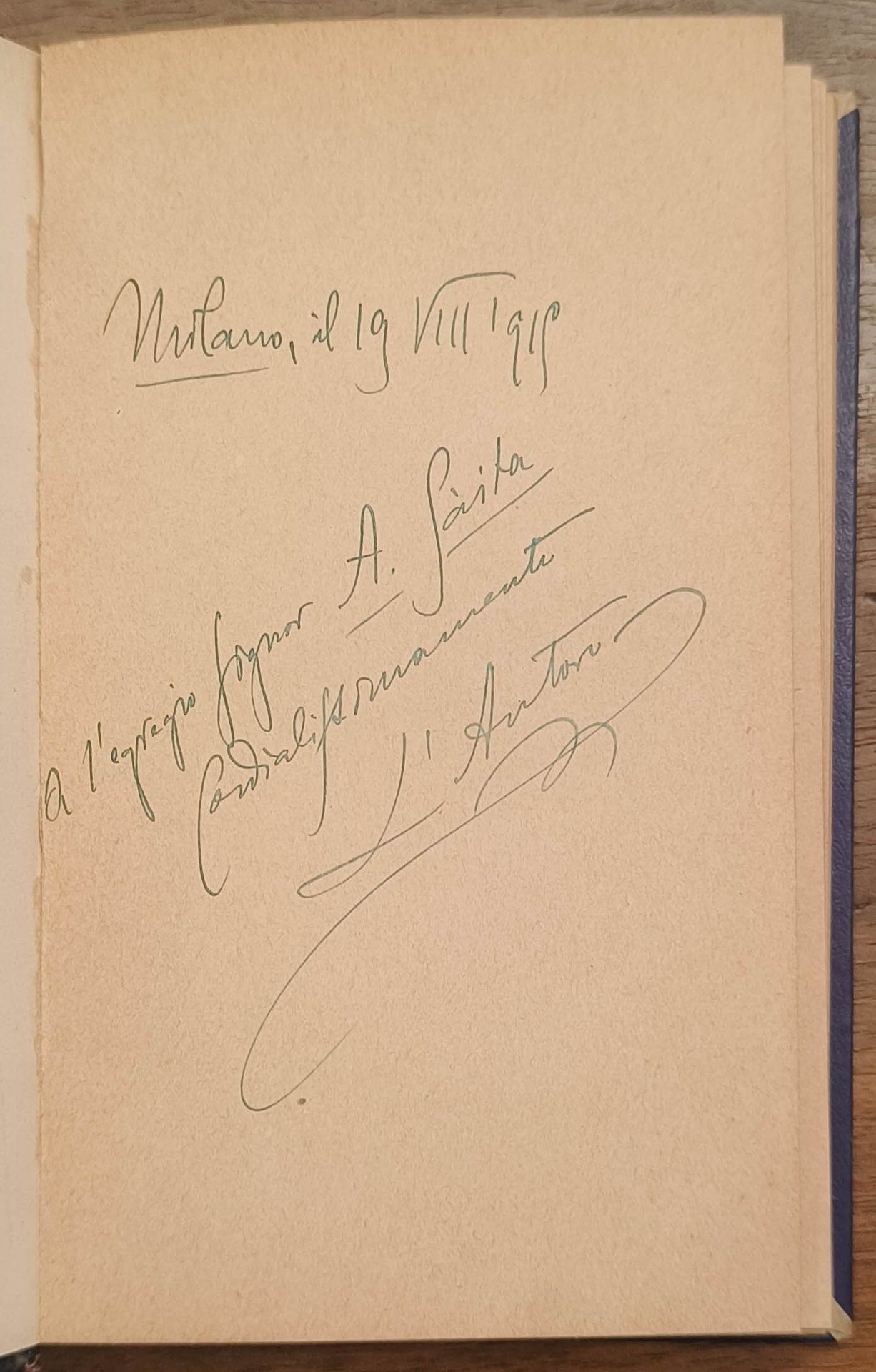 Cm 15,7. Pp. 105. Legatura in mezza pelle, dorso con segni d’usura e mancanza. All’interno si conserva copertina anteriore della brossura originale. Dedica autografa dell’autore datata “Milano, 19 VIII 1919” “a l’egregio Signor A. [?] cordialissimamente L’Autore”.