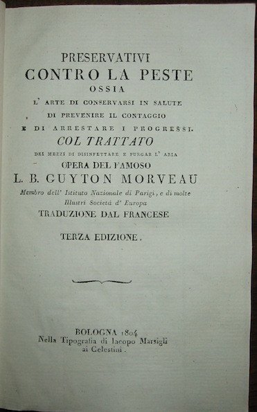 Preservativi contro la peste ossia l’arte di conservarsi in salute, di prevenire il contaggio e di arrestare i progressi. Col Trattato dei mezzi di disinfettare e purgar l’aria. Opera del famoso L.B. Guyton Morveau.