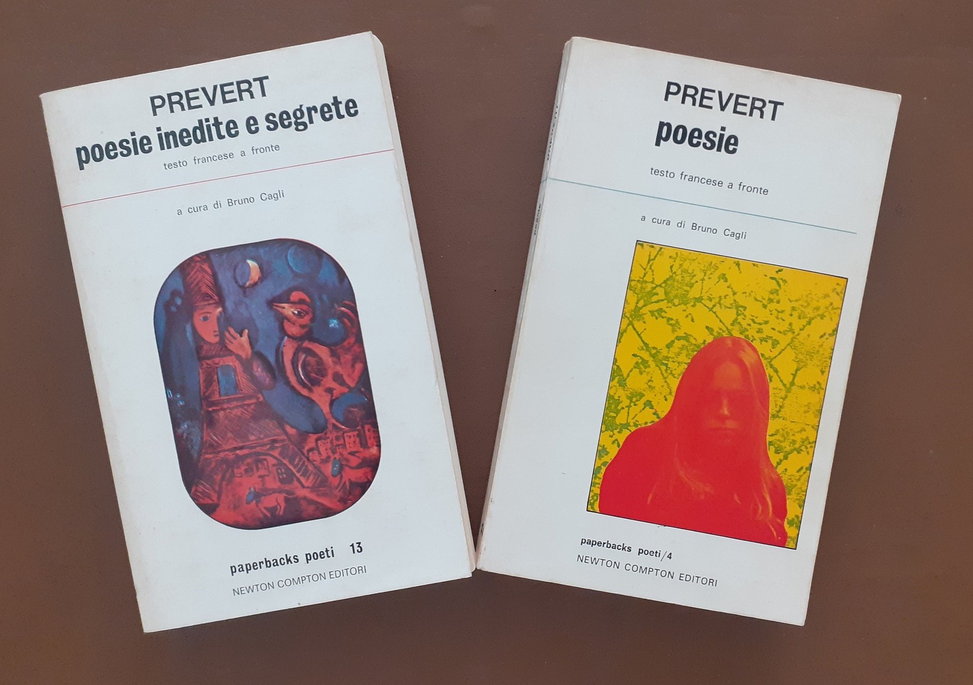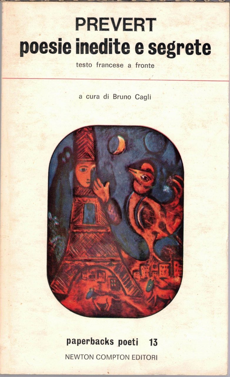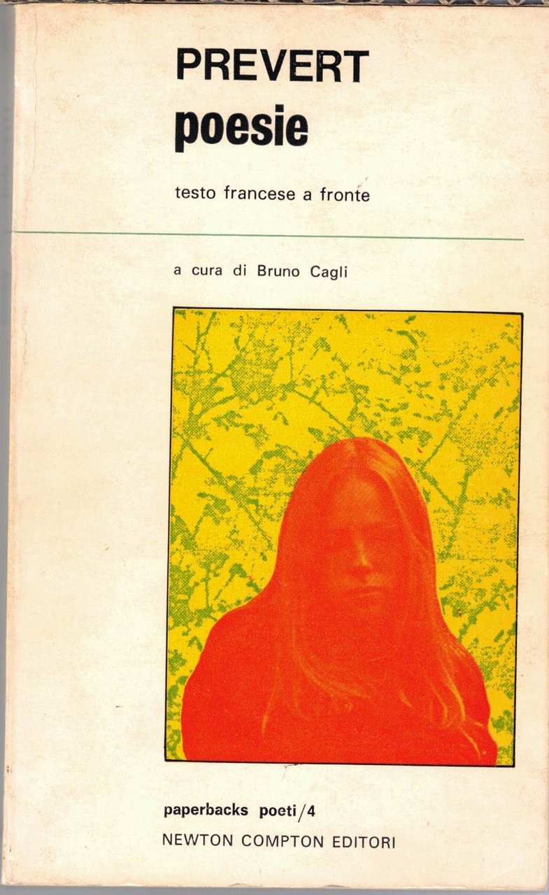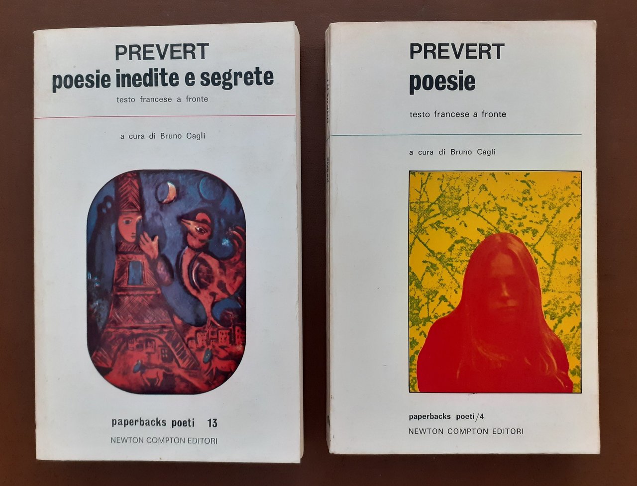 Jacques Prévert, Poesie, a cura di Bruno Cagli, Newton Compton Italiana (Newton Compton Editori s.r.l.), Roma 1974, quinta ed., pp. 269, cm 20, br. ed. (Collana Paperbacks. Serie Poeti, n. 4. Titoli originali: Spectacle – La pluie et le beau temps. Traduzione di Bruno Cagli). In lotto con: Jacques Prévert, Poesie inedite e segrete, a cura di Bruno Cagli, Newton Compton Italiana, Roma 1975, quarta ed., pp. 235, cm 20, br. ed. (Collana Paperbacks. Serie Poeti, n. 13. Titoli originali delle opere: Paroles e Spectacle. Traduzione di Bruno Cagli e Raffaello Delfino). Il lotto comprende due volumi di Prévert, Poesie e Poesie inedite e segrete, entrambi editi nelle ed. Newton Compton, collana Paperbacks. Serie Poeti, voll. 4 e 13. Entrambi i volumi presentano testo in lingua originale a fronte. Leggere tracce d’uso, tenue brunitura della carta, per il resto esemplari ben conservati.