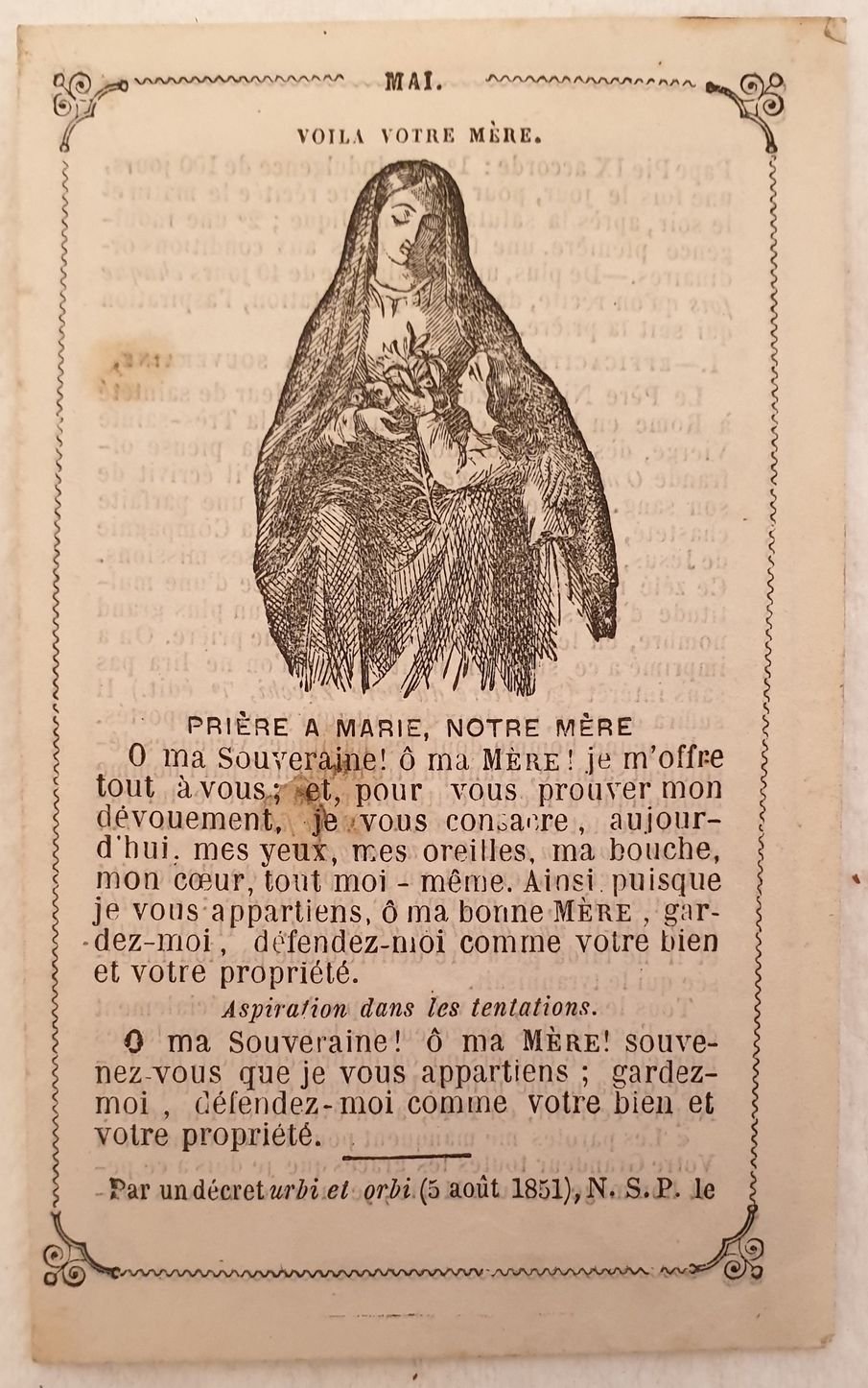 Fascicoletto del 1860 circa dedicato a Maria Nostra Signora del 1860 circa. All'interno preghiere, efficacia della preghiera, Ragioni di questa efficacia. Testo in francese. In ottime condizioni. In 24. Dim. cm 11,5x7. Pp. (4)Pamphlet of 1860 circa dedicated to our Lady Mary of 1860 circa. Inside prayers, reasons. Text in french language In very good conditions. In 24. Dim. cm 11,5x7. Pp. (4)