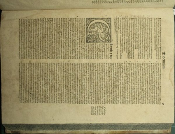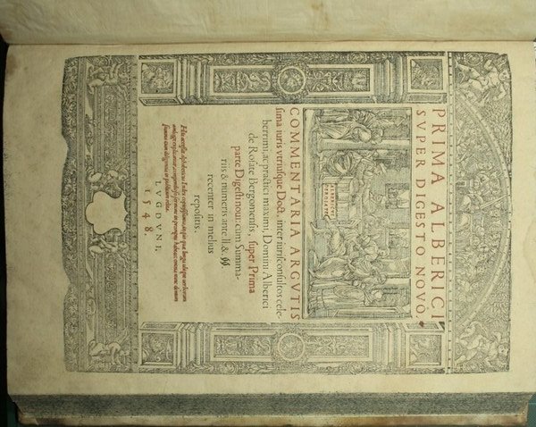 Super Prima parte Digesti novi: cum Summariis & numeris ante II & §§ recenter in melius repositis - His accessit alphabeticus Index copiosissimus in quo quae longa ubique verborum ambage explicantur, compendioso sermone in promptu habeas: omnia nunc denum summa cum diligentia in publicum edita - In folio - pp.176 (numerazione solo sul recto) - Pergamena - Frontespizio illustrato, capilettera - Tagli spruzzati, frontespizio in rosso e nero, testo su due colonne - Gore in alcune pagine