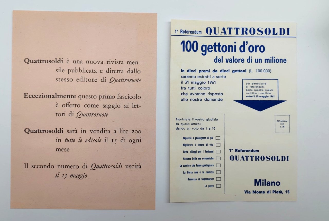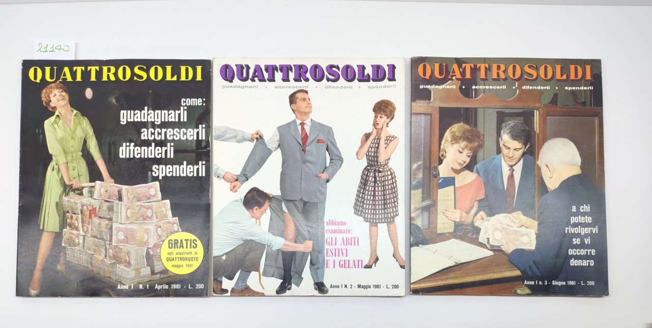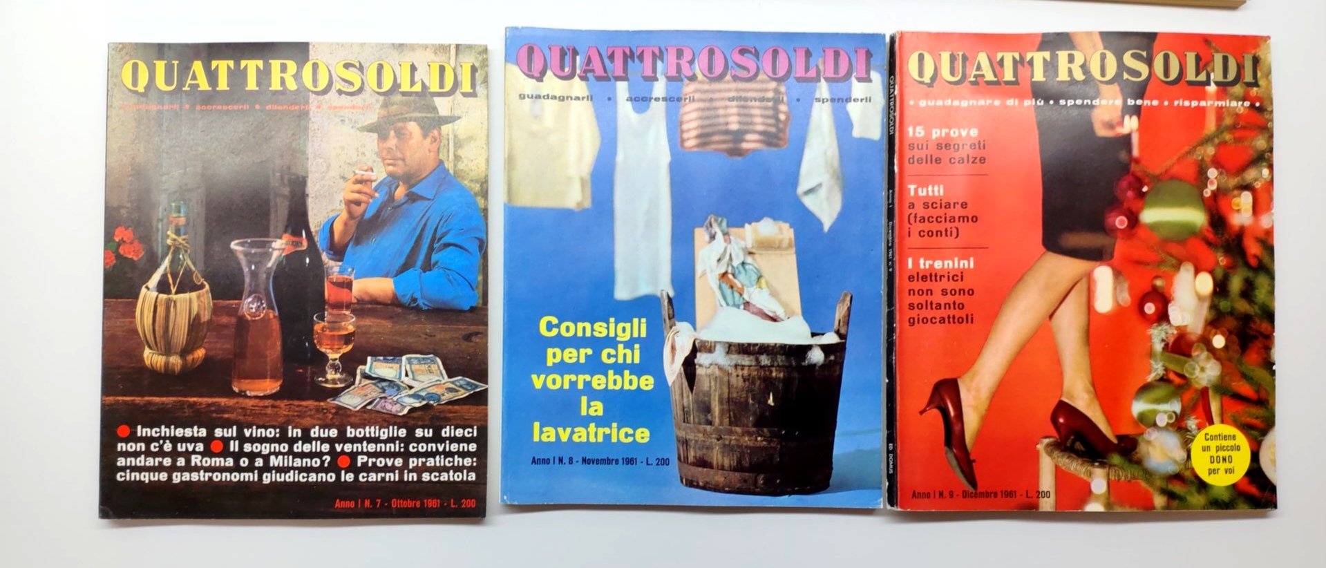 Prima annata completa in 9 numeri, dal N. 1 di aprile al n. 9 di dicembre 1961. Numeri singoli, non rilegati, in buone condizioni, segni del tempo, lievi abrasioni ai margini dei piatti e del dorso. Nel primo numero conservati una cedola editoriale e un volantino di presentazione della rivista. QUATTROSOLDI fu una rivista decisamente in anticipo sui tempi; per orientare il consumatore i giornalisti mettevano alla prova tutto: abiti, lavabiancheria, prodotti alimentari, sigarette, vini, liquori, carni in scatola, pesce, i premi a punti, lotterie, biro, camicie, inchieste sull'ambiente, costi del risparmio, delle vacanze, automobili ecc. ecc.