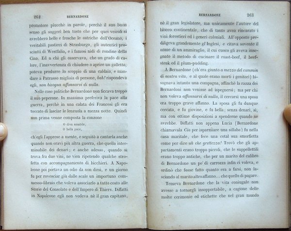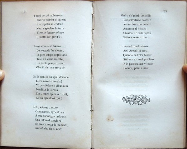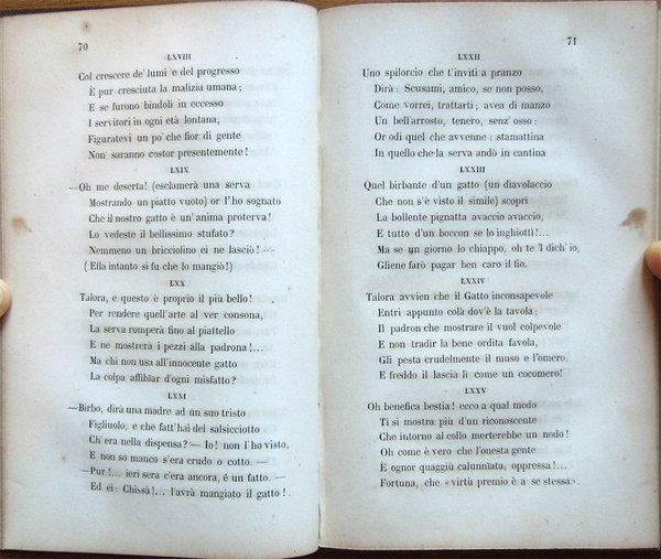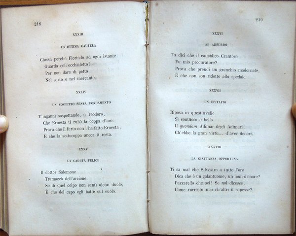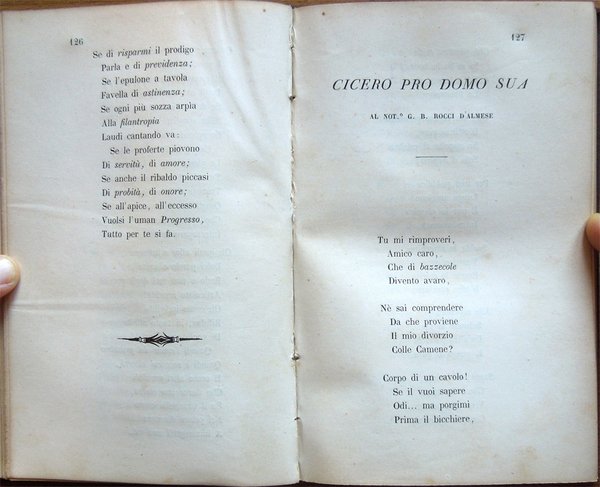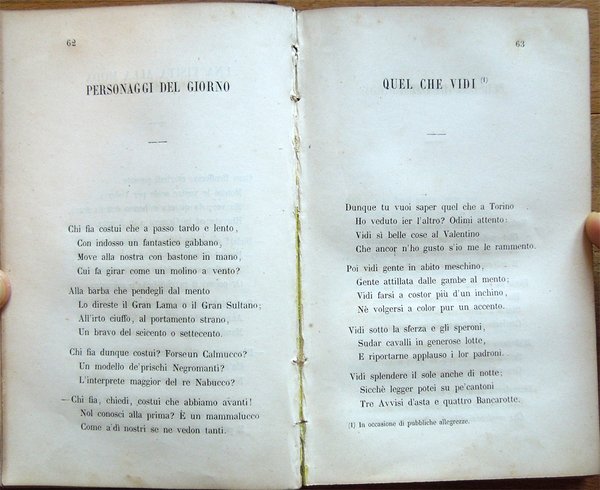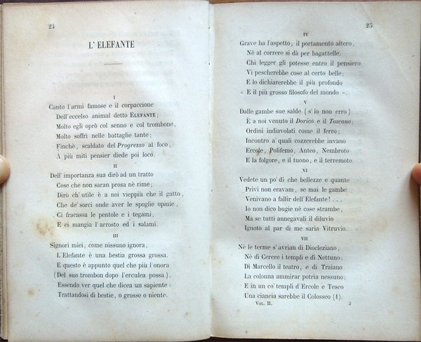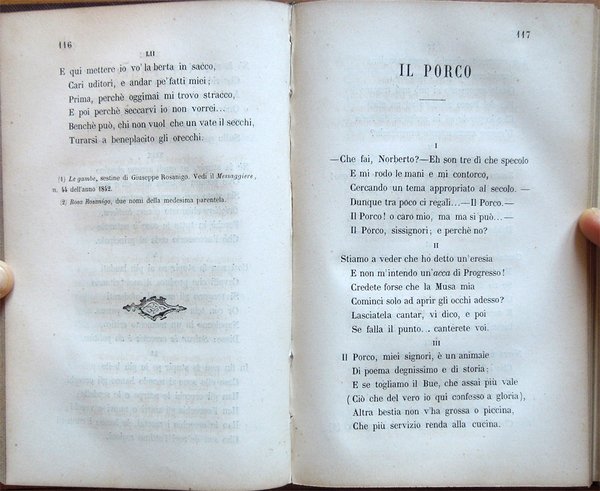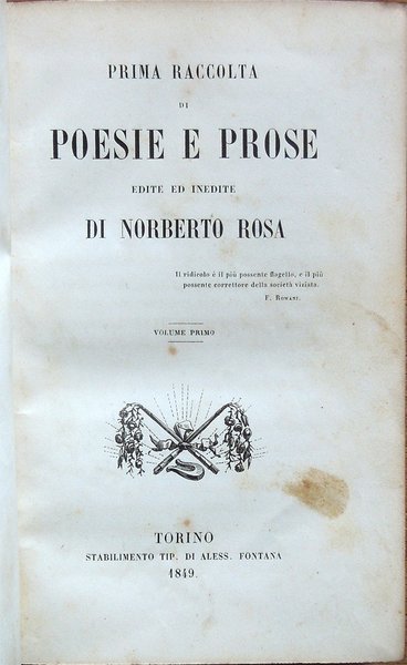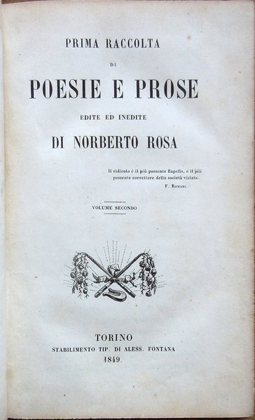 Due volumi in-16° (17 x 10,5 cm), pp. VIII, 344; (4), 324, (2), legatura coeva in tela con titoli e fregi in oro al dorso. Normali tracce d'uso alla legatura, in particolare, qualche piccolo, lieve alone ai piatti. Tagli decorati a spruzzo. Firma coeva d'appartenenza alla guardia anteriore di entrambi i volumi. Al volume primo, al frontespizio, piccola macchia, che non interessa i titoli, color marrone chiaro, di 1,8 x 1 cm; sempre al volume primo, nel margine inferiore della carta che ospita le pagine 271-272, strappo, che interessa il testo, senza perdite, perfettamente rimarginato con carta giapponese. Sporadici e piccoli segni d'umido alle pagine, per il resto, ben conservato. Si tratta della prima raccolta organica dei componimenti del Rosa, alcuni pubblicati qui per la prima volta, altri già apparsi su un giornale dell'epoca. Norberto Rosa nacque ad Avigliana nel 1803. Svolse la professione di procuratore legale a Susa e fu poeta, scrittore, pubblicista. La sua poesia, satirica e moralistica, assunse negli anni connotazioni più marcatamente politiche e civili. Morì a Susa nel 1862. Dalla prefatoria dell'autore ai lettori: «Qual è, diffatto, lo scopo al quale noi tendiamo da lunga pezza, e per cui sosteniamo l'odierna lotta di vita e di morte? Noi vogliamo, dapprima, la nostra lingua . Noi vogliamo, in appresso, che l'apparenza ceda il luogo alla realtà, l'impostura al merito; vogliamo cessata una volta questa pompa di titoli, questa ingiusta distinzione dei figli dello stesso Adamo in nobili e plebei, quasi che gli uomini si debbano altrimenti distinguere che dalle loro buone o cattive azioni . Vogliamo, soprattutto, la libertà e l'indipendenza di questa altrettanto bella quanto infelice Italia . Vogliamo liberare la società da quella turba di scioperati che vivono a spese dell'altare, anzi dei troppo creduli devoti, e ritornare la nostra religione alla purezza e semplicità del Vangelo . Noi vogliamo, in conclusione, rabberciare un poco questa logora palla del mondo, tanto che il sole vi riluca per tutti, né più vi sia chi maledica il primo istante in cui lo vide . Così avendo anch'io portato la mia pietra (frase obbligata) all'edifizio dell'italiano, anzi dell'umano incivilimento, ho ragione a pretendere che altri non guardi le cose mie come roba dell'altro secolo, anzi dell'altro mondo. E tanto più ho ragione a questo, in quanto che io portai la prefata mia pietra allegramente e ridendo, non brontolando e piagnucolando come fan tanti. Ed eccovi, candidi Lettori, per quali considerazioni io non arrossisco di presentarvi anche a questi tempi le mie bazzecole; sperando anzi che avrete per le inedite quel medesimo compatimento di che già foste generosi alle stampate, quando videro primamente la luce nel Messaggiere Torinese. Viva l'Italia!».