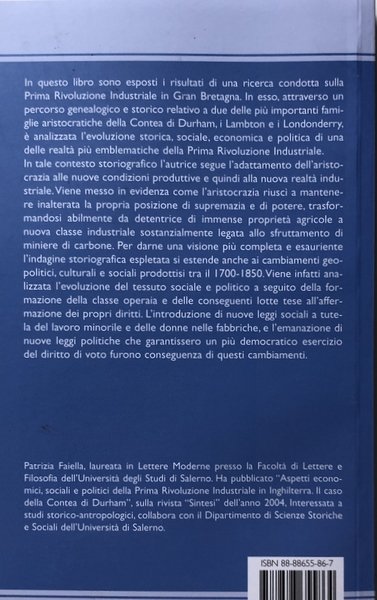 In questo libro sono esposti i risultati di una ricerca condotta sulla Prima Rivoluzione Industriale in Gran Bretagna. In esso, attraverso un percorso genealogico e storico relativo a due delle più importanti famiglie aristocratiche della Contea di Durham, i Lambton e i Londonderry, è analizzata l’evoluzione storica, sociale, economica e politica di una delle realtà più emblematiche della Prima Rivoluzione Industriale. In tale contesto storiografico l’autrice segue l’adattamento dell’aristocrazia alle nuove condizioni produttive e quindi alla nuova realtà industriale. Viene messo in evidenza come l’aristocrazia riuscì a mantenere inalterata la propria posizione di supremazia e di potere, trasformandosi abilmente da detentrice di immense proprietà agricole a nuova classe industriale sostanzialmente legata allo sfruttamento di miniere di carbone.