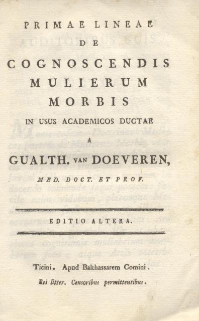 PRIMAE LINAE DE COGNOSCENDIS MULIERUM MORBIS. In usus academicos ductae a Gualth. Van Doeveren. Editio altera. (1775).