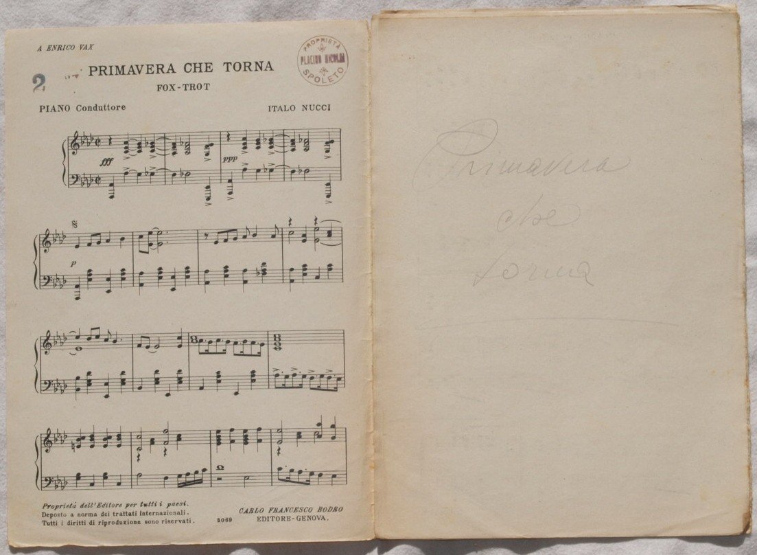 Bello spartito, partitura completa per orchestra senza data ma degli anni '30 di una canzone. Caratteristica copertina illustrata d'epoca. GENERE: Fox trot STRUMENTI: pianoforte; contrabbasso; violoncello; violino; flauto ANNO: anni '30 DIMENSIONI: In 8. cm 25,5x18 PAGINE: pp. 8 CONDIZIONI: In discrete condizioni, brossura editoriale mancante NOTE: Ex libris sulla copertina ed in alcune pagine. Beautiful score of one song, a complete score for orchestra of 1930's. Carachteristic decorated cover of that period. MUSIC: Fox trot STRUMENTI: piano; contrabbass; violoncello; violin; flute YEAR: 1930's SIZE: In 8. cm 25,5x18 PAGES: pp CONDITIONS: In fair conditions, editorial cover is missing NOTES: Ex libris in the cover and in some pages.