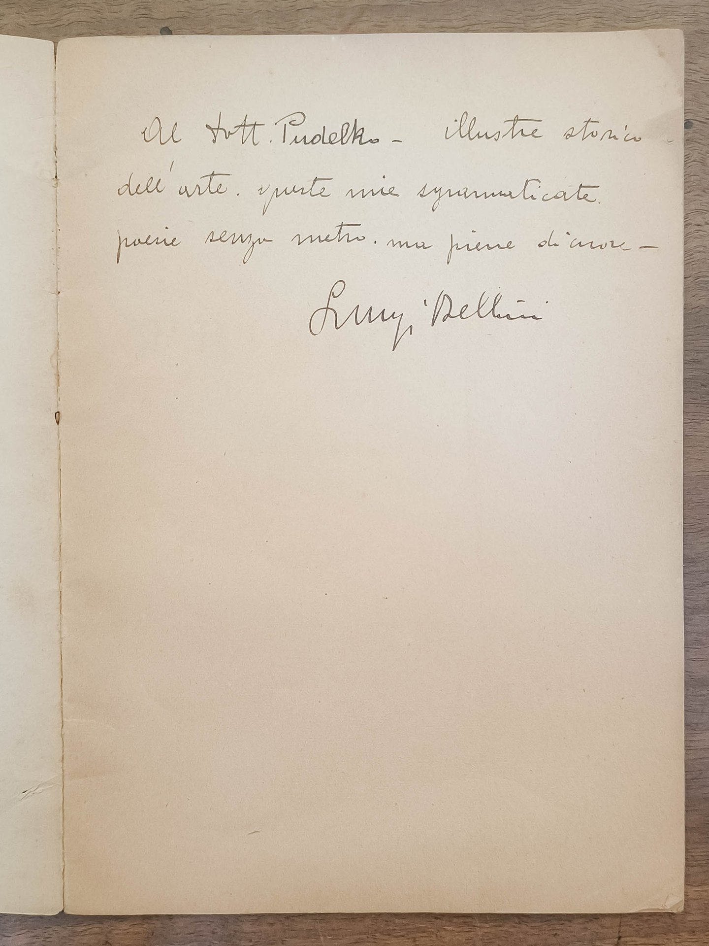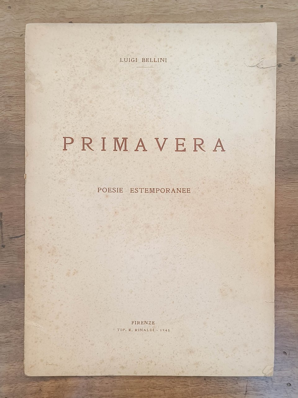 Primavera. Poesie estemporanee, Firenze, Rinaldi, 1943. Cm 24,2. Pp. 24. Brossura. Foxing alla legatura con qualche strappo. Due tavole fuori testo riproducenti i dipinti dell'autore. Esemplare n. 255 di 300 fuori commercio, realizzati in occasione del matrimonio tra Mario Bellini e Dodina Manfredi. Dedica autografa dell'autore a "Dott. Pudelko illustre storico dell'arte queste mie sgrammaticate poesie senza metro ma piene di cuore" (Giorgio Pudelko).