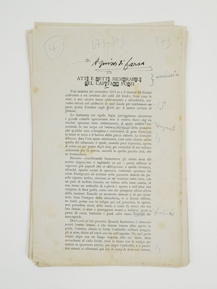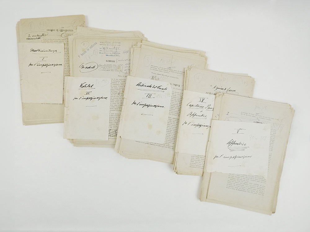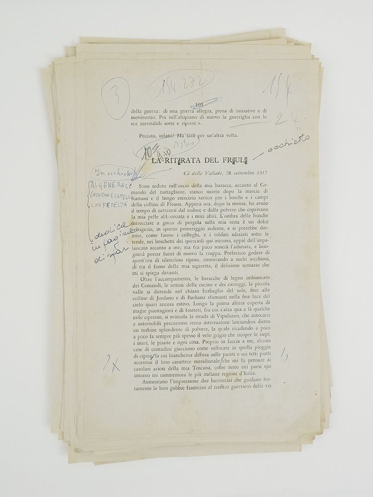 - fogli sciolti stampati solo al recto, avvolti in carta da pacco con indicazione manoscritta a inchiostro blu «Bozze prime del III volume», cc. 318 numerate a mano e così suddivise: 1-53 «Errore di coincidenza»; 54-153 «Kobilek»; 154-272 «La ritirata del Friuli»; 273-303 «Atti e detti memorabili del capitano Punzi»; 304-318 «Appendice». I fogli di ogni opera sono avvolti in un foglietto ripiegato con titolo manoscritto e indicazione «per l'impaginazione».