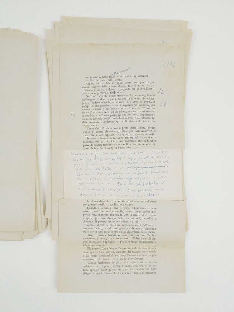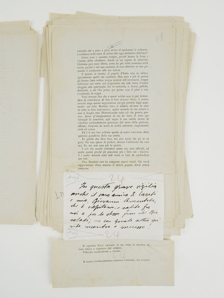 AUTOGRAFOPrime bozze del volume di Ardengo Soffici «Opere, III» stampato da Vallecchi nel 1960.CON AUTOGRAFO.Carte in ottime condizioni di conservazione. Su quasi ogni pagina indicazioni di modifica, vergate a china nera o a inchiostro blu da Soffici stesso. Oltre alle correzioni segnalate direttamente in bozza, l’autore aggiunge interi brani inediti, scritti a mano su fogli bianchi incollati alle pagine a stampa.Importante documento che attesta la prima revisione di bozze da parte dell’autore della raccolta uscita per Vallecchi nel 1960. Sono conservati, in fogli sciolti, tutti i testi poi pubblicati in volume dall’editore fiorentino: «Errore di coincidenza» (1a edizione); «Kobilek» (6a edizione), «La ritirata del Friuli» (5a edizione); «Atti e detti memorabili del capitano Punzi» (1a edizione) e «Appendice» (1a edizione), che comprende: I Cadorna, II Capello, III Ricordo di Udine in tempo di guerra, IV Le lettere di Cadorna. -- Le carte presentano numerosi interventi manoscritti dell’autore, nella maggior parte dei casi puntuali e minuti: correzione di refusi, uniformazioni ortografiche ed editoriali, scelte tipografiche (ad esempio, la dedicatoria, stampata in esergo in bozze, viene spostata all’occhietto), aggiunta di singole parole o sostituzioni sinonimiche. -- Oltre a queste modifiche in gran parte formali, che vengono accolte tutte nella definitiva edizione a stampa, si riscontrano anche interventi maggiormente significativi. Si pensi In particolare all’aggiunta dei nomi propri, o delle iniziali dei nomi, di personaggi che nelle edizioni precedenti e nelle bozze erano rimasti anonimi. La decisione di rendere note le identità di alcuni dei militari citati fu probabilmente maturata solo nelle ultime fasi di revisione dei testi, anche se probabilmente la scelta fu frutto di una riflessione più lunga, elaborata nel corso di un graduale distanziamento dall’esperienza della guerra e, soprattutto, in un tempo in cui la censura aveva cessato di intervenire sui testi pubblicati. Questo percorso di progressivo svelamento delle identità dei personaggi è ben evidente, ad esempio, nel confronto tra la prima edizione di «Kobilek», le bozze in nostro possesso e la versione a stampa. Sezioni del testo che nella prima edizione erano state censurate vengono dapprima reintegrate senza citare i nomi dei protagonisti, come si vede nelle bozze, e poi esplicitati, anche se parzialmente, solo con l’inserimento dell’iniziale, nella versione a stampa Vallecchi. -- Una menzione a parte meritano invece le aggiunte di interi paragrafi manoscritti su carte, poi incollate da Soffici alle pagine della bozza (una in «La ritirata del Friuli» e tre in «Kobilek»), tutte integrate e pubblicate nell’edizione del 1960. -- Infine vengono riscontrate alcune minime differenze, tra la bozza e l’edizione a stampa, non segnalate dall’autore nelle carte in nostro possesso. Probabilmente ci fu un ulteriore giro di correzioni, come testimonia peraltro la dicitura «bozze prime», manoscritta sulla carta da pacco in cui sono contenuti i fogli, e il timbro di intestazione impresso su alcune pagine: «1° bozza in colonna».