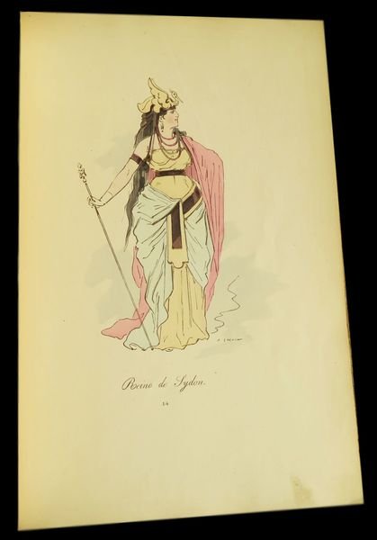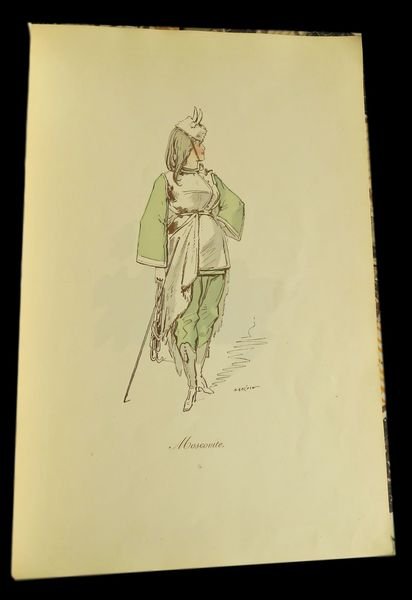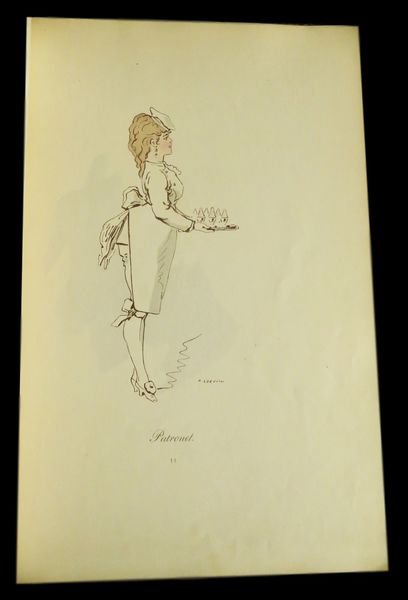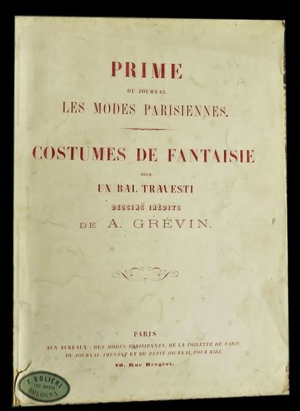 In 4° (32x23,4 cm); (28) cc. Brossura editoriale con titolo impresso in amaranto al piatto anteriore, qualche lieve traccia di sporco e due piccole mancanze al dorso. Antica pecetta ottocentesca al margine basso della brossura che identifica il volume come venduto dalla nota libreria bolognese F. Solieri Tre Mondi. Il libro raccoglie 24 belle tavole inedite in cromolitografia a colori, realizzate per un ballo in Maschera, disegnate dal grande illustratore e scultore francese, Alfred Grévin (Épineuil, 28 gennaio 1827 Saint-Mandé, 5 maggio 1892). Fra le tavole: La Gardeuse de dindons - La Bergère d'Arcadie - La Moscovite - Le Braconnier - La Petite Princesse - La Pompières - La Bouquetière, etc. Grevin si formò in scienze naturali e disegno naturalistico al collegio di Tonnerre, iniziò la sua carriera di disegnatore lavorando inizialmente apprendista disegnatore per conto della compagnia ferroviaria Chemins de fer de Paris à Lyon et à la Méditerranée. La svolta della sua vita avvenne nel 1853 quando trasferitosi a Parigi, iniziò a riscuotere enorme successo come caricaturista e autore di piccanti e sagaci vignette galanti in ambientazione popolare. Grevin, attento lettore della quotidianità della vita parigina, prestava grande attenzione alle mode ed ai costumi riproponendoli e rielaborandoli poi, nei suoi lavori. Prestò la sua arte ad alcuni dei più celebri giornali della sua epoca come il Journal Amusant, il Petit Journal pour rìre, la Le Gaulois e lo Charivari. Proprio la sua abilità nellelaborazione dei costumi lo portarono ad esser scelto come disegnatore ed ideatore dei costumi di scena di varie opere come ad esempio, per l'opera di Jacques Offenbach intitolata Le voyage dans la lune, oppure per quelli dell'opera La fille de Madame Angot di Charles Lecocq. Fu il fondatore, assieme a Adrien Huart, dellAlmanach des Parisiens e nel 1882 del primo Museo delle cere della storia che è intitolato con il suo nome. Opera, allinterno, in buone-ottime condizioni di conservazione. Rif. Bibl.: Colas 1330; Lipperheide 3186.