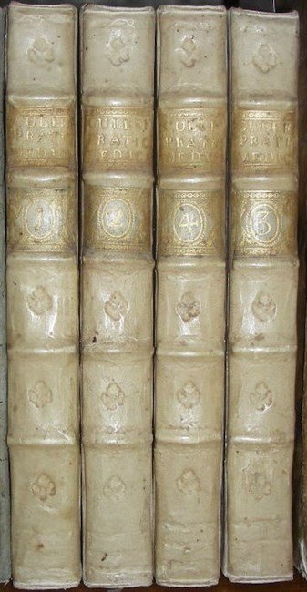 4 voll. in-8 gr., pp. XXIV, 252; 364; 275; 271, belliss. leg. p. perg. coeva impressa a secco ai piatti e ai d. con tit. oro e nervi, tagli spruzzati, segnalibro cons. Ex libris. Ottimo esempl. [067]