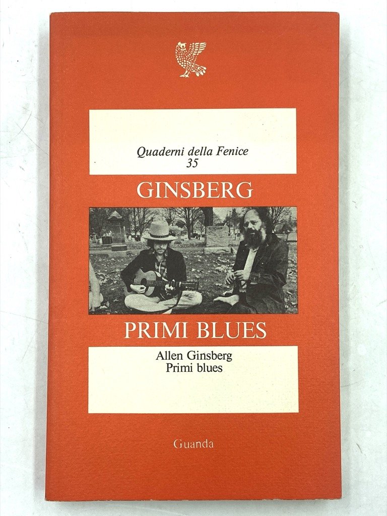 Brossura editoriale illustrata, cm 20 x 12, pp 173 (5). Testo originale a fronte. Collana Quaderni della Fenice, numero 35. Prima edizione italiana di First Blues (1975), pubblicata da Guanda nella collana diretta da Giovanni Raboni, con traduzione e cura di Carlo A. Corsi e testo originale a fronte. Raccolta dedicata a Bob Dylan, ritratto in copertina con l’autore. In fine, le partiture di alcuni testi.