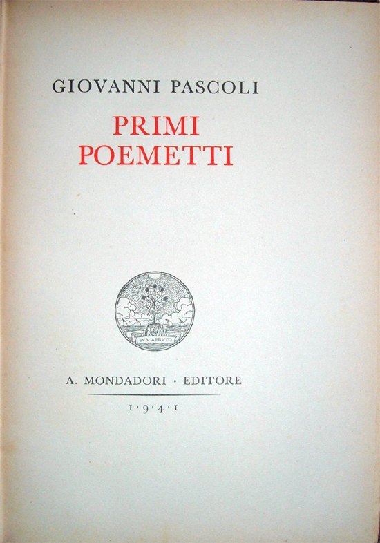 In-8° (cm 24,6x15,9), pp. XVIII, (2), 197, (11), bella legatura coeva in mezza pelle rossa con dorso a sei scomparti e titoli in oro al secondo scomparto. Conservate le copertine originali. Al piatto posteriore, piccola abrasione nel bordo superiore della parte in pelle. Leggerissime arrossature ai margini delle pagine, dovute al tipo di carta, per il resto buon esemplare parzialmente intonso. Quattordicesima edizione. Volume composto con caratteri Baskerville e curato nel testo da Maria Pascoli e da Angelo Sodini.