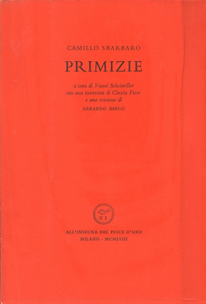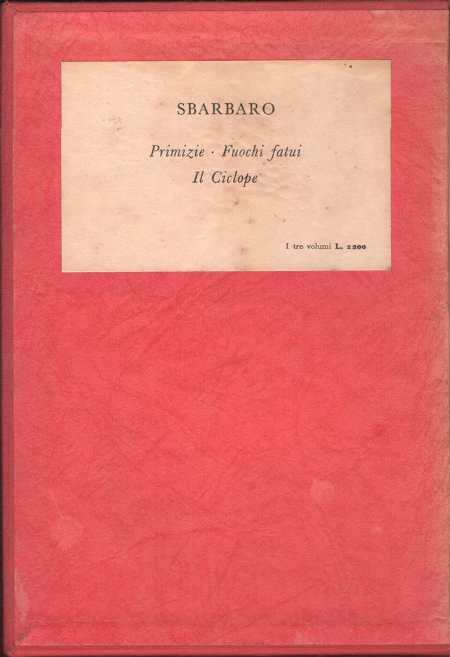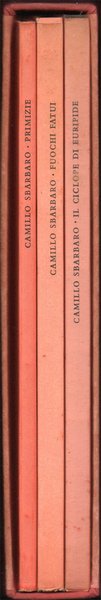 Tre volumi in-16° (17,7 x 12,1 cm), pp. (6), 32, (10); 102, (2); 64, (4), copertina editoriale con sovraccoperta in acetato trasparente e cofanetto editoriale in mezza tela con titoli su tassello, in carta, applicato ad una delle facciate. Il colore delle copertine si presenta lievemente sbiadito ai dorsi, probabilmente a causa di esposizione alla luce. La copertina anteriore dell'opera Primizie presenta un leggero segno di piegatura longitudinale nella parte sinistra e alcune ondulature, sempre longitudinali, nella parte destra, con tutta probabilità dovute alla sovraccoperta editoriale in acetato, un po' stretta. Qualche leggero segno d'uso e del tempo al cofanetto. Dettaglio delle opere: Primizie: una xilografia in bianco e nero, in antiporta, nel testo; qualche piccolissima macchia al taglio di testa; pochi, lievi, piccoli segni d'umido alla prima e all'ultima pagina bianca, per il resto, molto ben conservato. Prima edizione. Volume numero 3 nella collezione "Acquario". Opera impressa dalla Stamperia Valdonega di Verona in 1000 copie numerate da 1 a 1000, la presente è la 886. Fuochi fatui: molto ben conservato. Seconda edizione accresciuta, marzo 1958 (la prima era stata pubblicata nel giugno 1956). Volume numero 4 nella collezione "Acquario". Opera impressa dalla Stamperia Valdonega di Verona in 1000 copie numerate da 1 a 1000, la presente è la 254. Il ciclope: leggero alone d'umido nel bordo esterno delle prime tre carte e delle ultime due, per il resto molto ben conservato. Volume numero 5 nella collezione "Acquario". Opera impressa dalla Stamperia Valdonega di Verona in 1000 copie numerate da 1 a 1000, la presente è la 682. Raccolta in cofanetto non comune.
