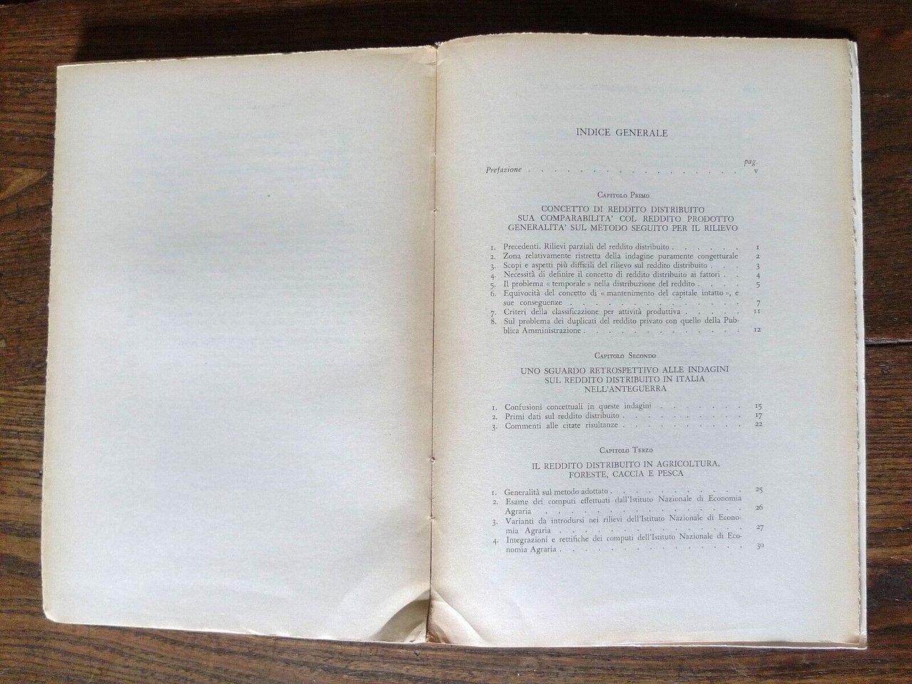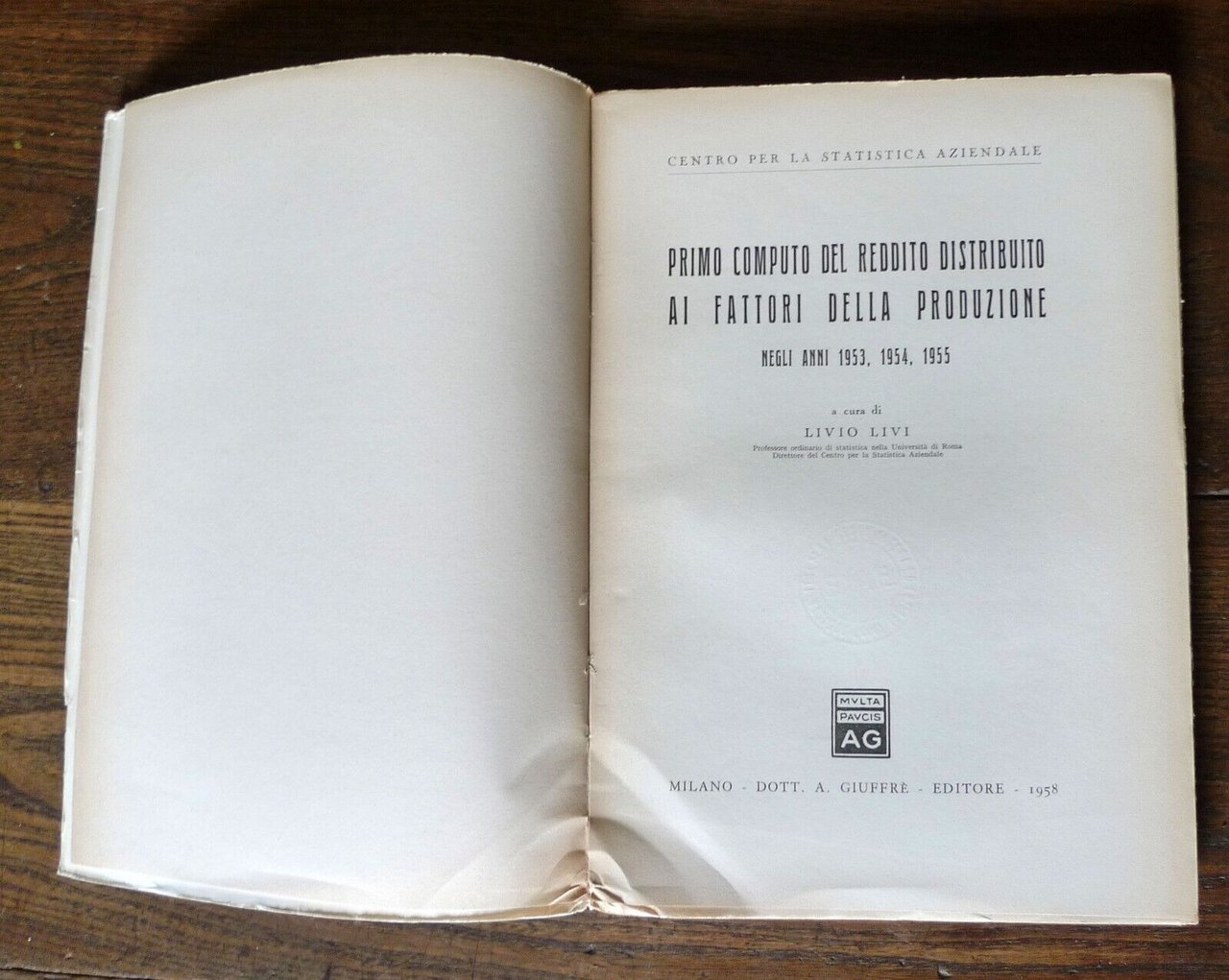 PRIMO COMPUTO DEL REDDITO DISTRIBUITOAI FATTORI DELLA PRODUZIONENEGLI ANNI 1953, 1954, 1955.A cura di Livio Livi.Milano, Dott. A.Giuffrè Editore, 1958,brossura, 25x18 cm., pp.VII-211,peso: g.400