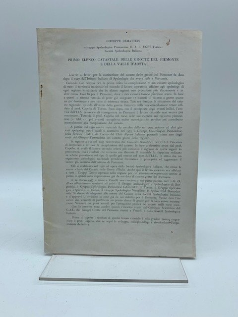 In 8, cm 17 x 24, pp. 20 (compresa brossura). Testimonianza del primo lavoro di catasto speleologico in Piemonte costruito su basi e criteri moderni. In effetti un tentativo di catasto nazionale era stato gia' avviato nel 1927 ma pochi furono i dati raccolti per il Piemonte. Solo nel 1957, a Vercelli, con l'incontro dei pochi gruppi operanti in regione, fu deciso l'inizio del lavoro che vide il suo compimento con questo pubblicazione. Il censimento venne realizzato secondo i criteri ancora attualmente utilizzati, la regione suddivisa in 6 diverse aree per 189 cavita' totali