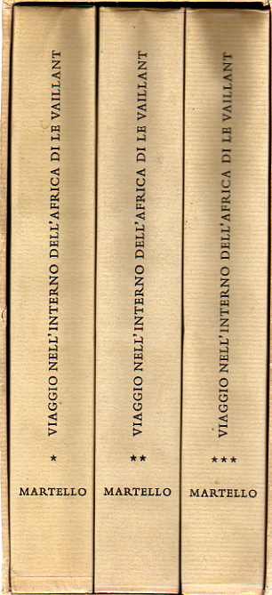 In-16, 3 volumi, brossura, titolo al dorso, acetato, custodia, pp. 296; 302; 292, con molte tavole a colori fuori testo. Edizione composta e stampata da Luigi Maestri. Ristampa della prima edizione italiana Raccolta di viaggi dopo quelli di Cook stampata da Sonzogno. Viaggio nelle zone fino ad allora inesplorate dell'Africa del celebre ornitologo francese Allo stato di nuovo (brand new copy).