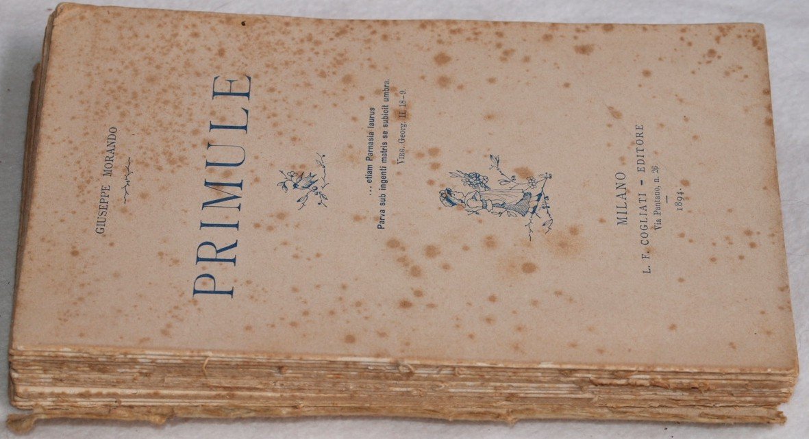 In 16. Dim. 16x10 cm. Pp. 227. Prima edizione del 1894 di questa raccolta di poesie di Giuseppe Morando. L'opera è in un volume ed è completa. In mediocri condizioni. Brossura editoriale in mediocri condizioni generali con usure ai margini e dorso; copertina staccata dal corpo del libro e piatto anteriore assente. Legatura in mediocri condizioni. All'interno le pagine si presentano in buone condizioni con fioriture. First edition of 1894 of thsi collection of poems by Giuseppe Morando. The work is in one volume and it is complete. In poor conditions. Editorial cover in poor general conditions with wearings in the edges and spine; cover detached from the body of the book and front plate missing. Binding in poor conditions. Inside pages are in good conditions with foxings.