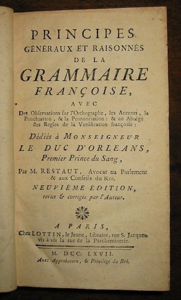 Principes généraux et raisonnés de la grammaire françoise. dedies à Monseigneur le Duc d’Orleans Premier Prince du Sang