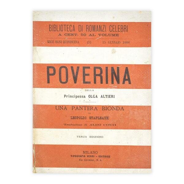 Autore: Principessa Olga Altieri Titolo: Poverina Edizione: Verri editrice 1888 Dimensioni: 18,5x12,5 cm Pagine: 266 Copertina: Brossura Condizioni: Buone come da foto