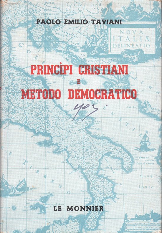 In-8° (21 x 14 cm), pp. IX, (1), 375, (1), legatura editoriale con sovraccoperta. Alla sovraccoperta, firma d'appartenenza, nella parte anteriore, e qualche normale segno d'uso e del tempo, in particolare, due strappetti, senza perdite, nel bordo superiore, ben rimarginati da piccolo intervento di restauro, e qualche piccolo segno d'umido alla parte posteriore e alle alette. Leggere tracce d'umido al taglio di testa e alla guardia anteriore, tracce rare, piccole e lievissime alle pagine. Per il resto, ben conservato. Indice: Prefazione; Cristianesimo e democrazia; Autorità e libertà; Partiti e democrazia; Il concetto di Democrazia Cristiana nel Toniolo; Da Ozanam a Sturzo: origini della Democrazia Cristiana; Luigi Sturzo nella storia italiana; La Democrazia Cristiana e l'unità politica dei cattolici italiani; La Democrazia Cristiana e l'attualità della Resistenza; De Gasperi e il nuovo ordine internazionale; La Democrazia Cristiana e l'aspirazione al «mondo unico»; La Democrazia Cristiana e l'unità europea; La Democrazia Cristiana e il «terzo mondo»; Il rapporto di logico sviluppo tra individualismo e comunismo; Spunti e appunti sulla questione sociale; Vanoni: lazione sociale e il senso dello Stato; La Democrazia Cristiana e il senso dello Stato.