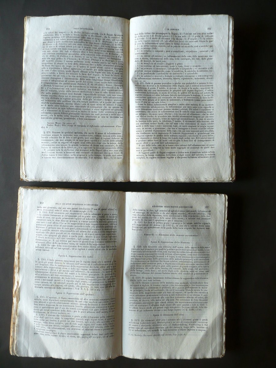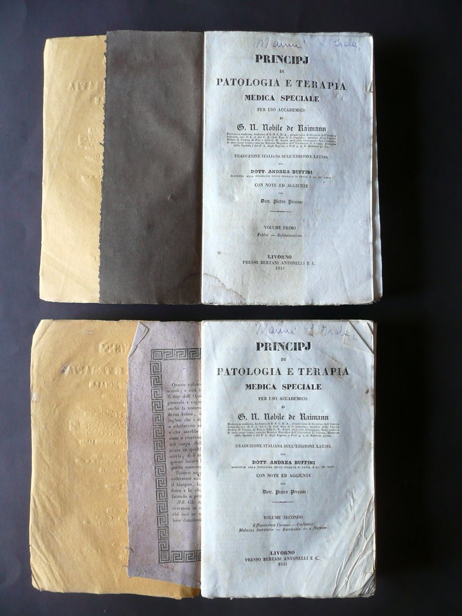 G. N. Nobile de Raimann, Principi di patologia e terapia medica speciale per uso accademico di G. N. Nobile de Raimann traduzione italiana sull'edizione latina del Dott. Andrea Buffini con note e aggiunte del Dott. Pietro Perrone Volume primo: febbri - infiammazioni Volume secondo: efflorescenze cutanee - cachessie - malattie secretorie - escretorie - e nervose Presso Bertani Antonelli e C., Livorno 1843; cm 23,5x15; pp. VIII-352 (volume primo); pp. 472 (volume secondo); brossura ed. Brossura ant. di ciascun volume con due tracce di vecchi timbretti per approvazione censoria. Frontespizio di ciscun volume con nome del precedente proprietario annotato a penna blu. Opera completa in due volumi. Condizioni di conservazione Volumi entrambi ben conservati con tracce d'uso, brossure con pressoché trascurabili accenni di sporco, angoli delle brossure e di qualche pagina con piccole pieghette / accenni di pieghette; cuffia inferiore del primo volume con una lieve ombra di gora che interessa in misura leggera anche gli interni ma non il testo. Pagine ben conservate con alcune piccole lievi bruniture; margini con barbe. Opera completa in due volumi. Esemplare raro. SETT141.L13949 N