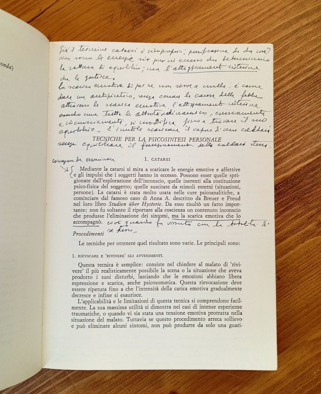 Prima edizione italiana. Collana "Psiche e coscienza" - Brossura editoriale di 276 pagine. Segni d'uso al dorso, diffuse sottolineature e postille a matita e a penna; copia per il solo studio -- La psicosintesi, come indica il suo nome, ha per scopo di unificare in una sintesi armonica tutti gli aspetti della personalità umana (fisico, emotivo, mentale e spirituale) sia consci che inconsci. Per farlo impiega numerose tecniche psicologiche (più di quaranta) combinate in vari metodi ed esercizi. Fra quelle più usate, ampiamente descritte in questo libro, vi sono: la catarsi; la trasformazione e la sublimazione delle energie psichiche; varie tecniche immaginative; l'attivazione e l'uso della volontà e delle funzioni transpersonali; la disidentificazione e l'autoidentificazione. Il suo campo d'azione originario e principale è quello medico, cioè la cura dei disturbi neuropsichici e psicosomatici. Inoltre, è stata ed è sempre più usata nel campo educativo, tanto famigliare quanto scolastico. Infine, si presta ad applicazioni interindividuali e sociali, dalla psicosintesi della coppia e del gruppo famigliare a quella di ogni genere di comunità, fino ad includere l'intera umanità. In questo libro, che ha avuto una precedente edizione in inglese (New York, 1965 Hobbs Dorman and Co.) Assagioli espone i principi, i metodi e le tecniche della psicosintesi.