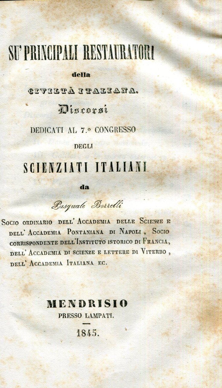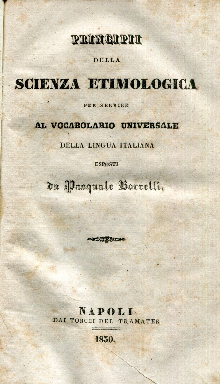 Principii della scienza etimologica per servire al vocabolario universale della lingua italiana esposti da Pasquale Borrelli, insieme a: Su principali restauratori della civilta italiana : discorsi dedicati al 7. Congresso degli scienziati italiani, Mendrisio : presso Lampati, 1845