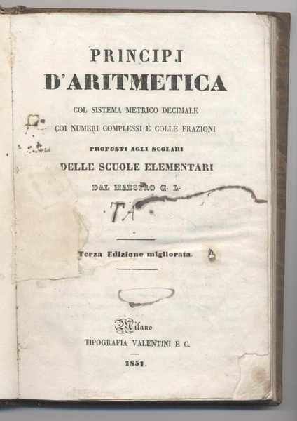 Principj d'aritmetica col sistema metrico decimale coi numeri complessi e colle frazioni proposte agli scolari delle scuole elementari dal maestro G. L.