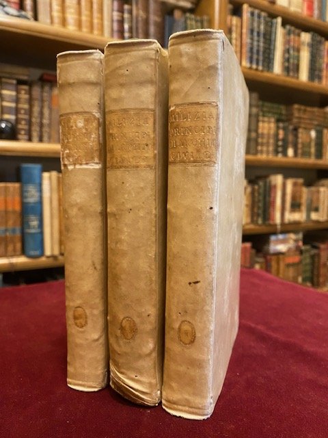 Opera in tre volumi con legature in tutta pergamena coeva, tasselli ai dorsi con titolo in oro, buone condizioni generali, estremità del secondo volume con uno schiacciamento nel complesso buoni esemplari. Completi delle 36 tavole f.t. ripiegate. Seconda edizione veneta ma la prima completa che include le 27 tavole addizionali incise e disegnate da Giovan Battista Cipriani, la spiegazione e la biografia del Milizia. Sc. C.