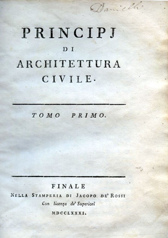3 volumi in-8° (210x152mm), pp. 8 (frontespizio e 'Idea generale dell'architettura'), 480; 515; 441; legatura coeva p. pergamena con titoli calligrafati su tasselli ai dorsi. Tagli marmorizzati policromi. Tabelle n.t. e una tabella ripiegata tra le pp. 180-181 del terzo vol. 8 tavv. incise su rame f.t. in fine del terzo vol. Antiche firme di appartenenza al margine superiore dei frontespizi. Aloni marginali di lieve entità, segnatamente al primo volume, sparse fioriture e bruniture leggere. Bell'esemplare nel complesso. Prima edizione, molto rara, impressa in forma anonima in Liguria, a Finalborgo (Finale Ligure), di uno dei maggiori classici della trattatistica architettonica, concernente ogni possibile àmbito dell'edilizia civile. Schlosser / Magnino, p. 683. Manca al Fowler e al Cicognara che, n. 566, registra soltanto l'edizione remondiniana del 1785.