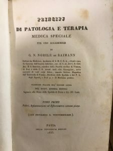 [vt] Traduzione italiana sull'edizione latina del Dott. Andrea Buffini. Tomo primo: febbri, infiammazioni ed efflorescenze cutanee piane. Tomo secondo: efflorescenze cutanee elevate, cachessie, malattie secretorie e escretorie, e nevrosi. Appunti manoscritti alla sguardia al tomo II. Piccole leggere fioriture a qualche pagina e ai tagli, tagli superiori leggermente polverosi, abrasioni ai piatti e ai dorsi, più che buono nel complesso. Pagg. 627;623. Cartonato rigido ottocentesco. Mis mm 220x135