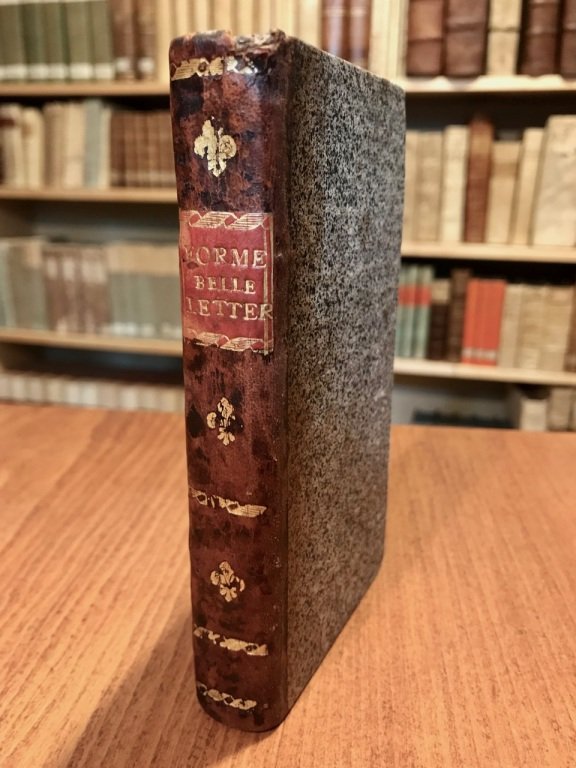 In-12° (cm. 14), legatura coeva in mezza pelle con titolo su tassello e fregi in oro al dorso (piccolo difetto alla testa), tagli rossi, piatti e risguardi marmorizzati; pp. 299 in ottimo stato, con qualche antica voce manoscritta. Curiosa panoramica su tutti i tipi di generi letterari elencati ed analizzati in 62 capitoli dove trovano spazio anche riflessioni sull'origine della stampa e delle biblioteche. Esemplare molto buono. (NF6)