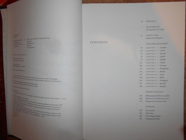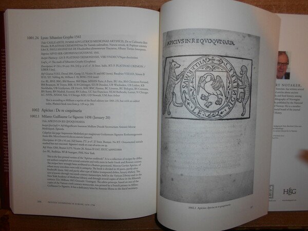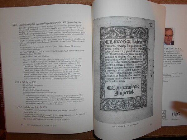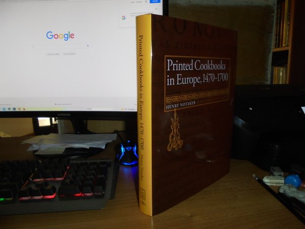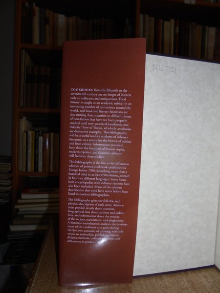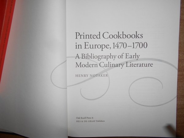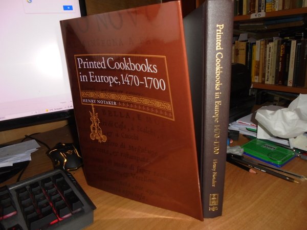HENRY NOTAKER. Netherland, Hes & Oak & De Graaf, 2010. Printed Cookbooks in Europe, 1470-1700. A Bibliography of Early Modern Culinary Literature. In-4°, similtela con titolo in oro sul dorso, sovracopertina a colori. ix, 395 pp. con alcune riproduzioni in tavole fuori testo. In stato di nuovo. Uff. C - II - 1