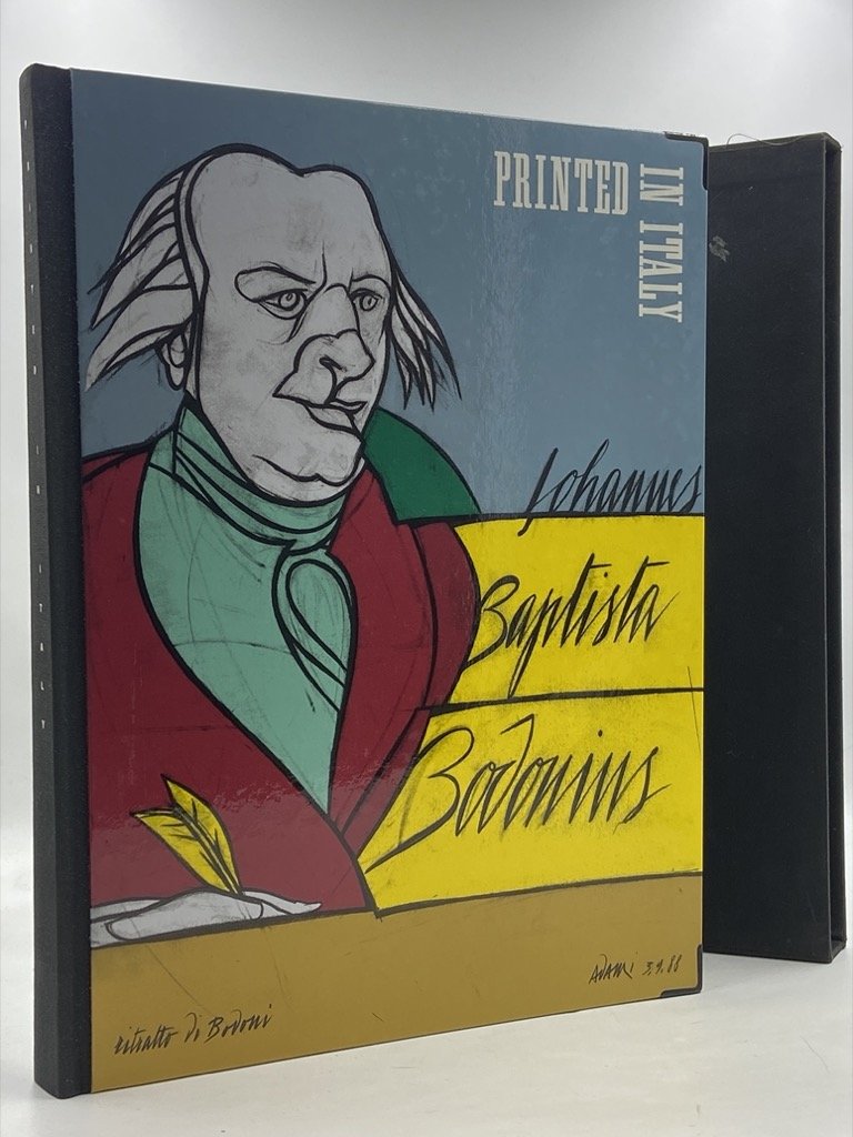 Legatura editoriale illustrata, piatti cartonati con angoli metallici, dorso in tela, custodia rigida in tela nera, cm 33x25, pp (166) non numerate illustrate in nero e a colori, alcune tavole ripiegate. Tracce d'uso sulla custodia, ottimo il volume. Sontuoso saggio delle capacità dell’industria grafica italiana dell’epoca, il libro è stampato su carte e con tecniche diverse, sempre esplicitamente indicate. La copertina è un ritratto di Giambattista Bodoni firmato da Valerio Adami. Radunati da Italo Lupi, che con Silvia Garofoli curò l’impaginazione del volume, al progetto parteciparono gli illustratori Franco Balan, Julia Binfield, Max Casalini, Steven Guarnaccia, Paolo Guidotti, Federico Maggioni, Giovanni Mulazzani, Ferenc Pinter e Guido Scarabottolo, e i fotografi Gabriele Basilico, Romano Cagnoni, Mario Carrieri, Cesare Colombo, Mario De Biasi, Gianni Berengo Gardin, Luigi Ghirri, Antonio Martinelli, Antonia Mulas, Toni Nicolini, Giuseppe Pino, Francesco Radino, Sergio Efrem Raimondi, Roberto Schetzen, Ferdinando Scianna, Enzo Sellerio, Leo Torri e Franco Zecchin; contributi grafici furono conferiti fa Franco Balan, Saipaul Bhamra, Mimmo Castellano, Pierluigi Cerri, AG Fronzoni, David Hillman, Bruno Monguzzi, Bob Noorda e Roberto Sambonet. Segnaliamo tra i vari interventi: i ritratti di Colombo ai lavoratori dell'industria grafica, stampati in denso rotocalco, le fotografie coloratissime fotografie di Italo Lupi ad un vecchio Luna Park, su carta vergata, il gioco del calcio con cartoncino di pedine, il «Grand Tour» di carte da lettera immaginate da Castellano per de Sade, Noorda per Goethe, Balan per Turner, Hillman di Pentagram per Byron, Cerri per Le Corbusier., le serigrafie di Balan, Scarabottolo, e Binfield, gli specimen di caratteri bodoniani e da antichi campionari cromolitografici.