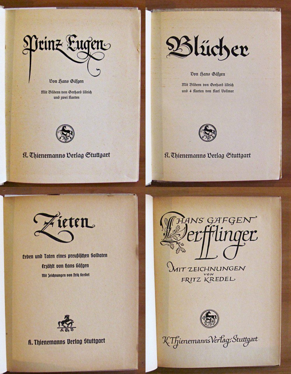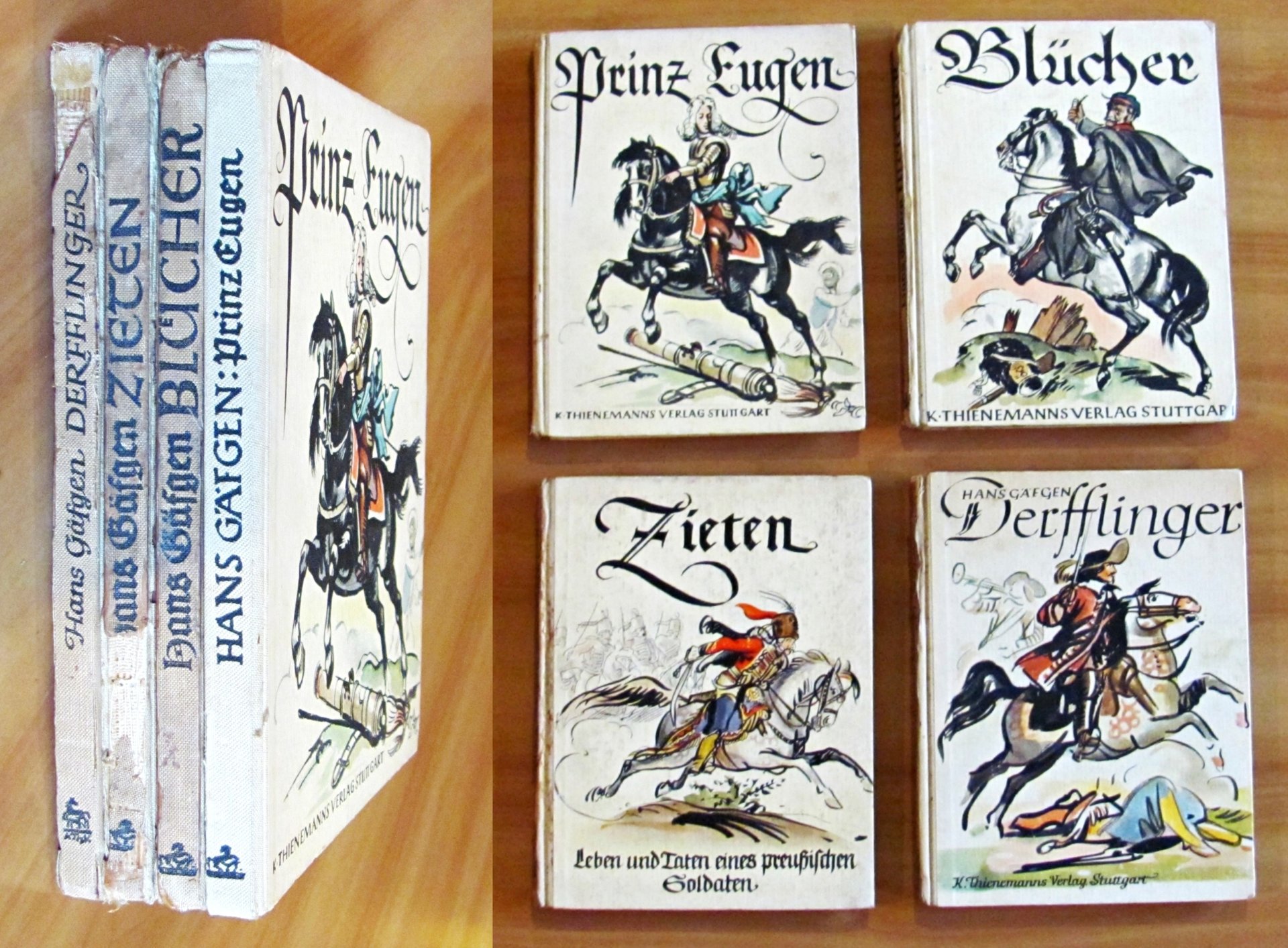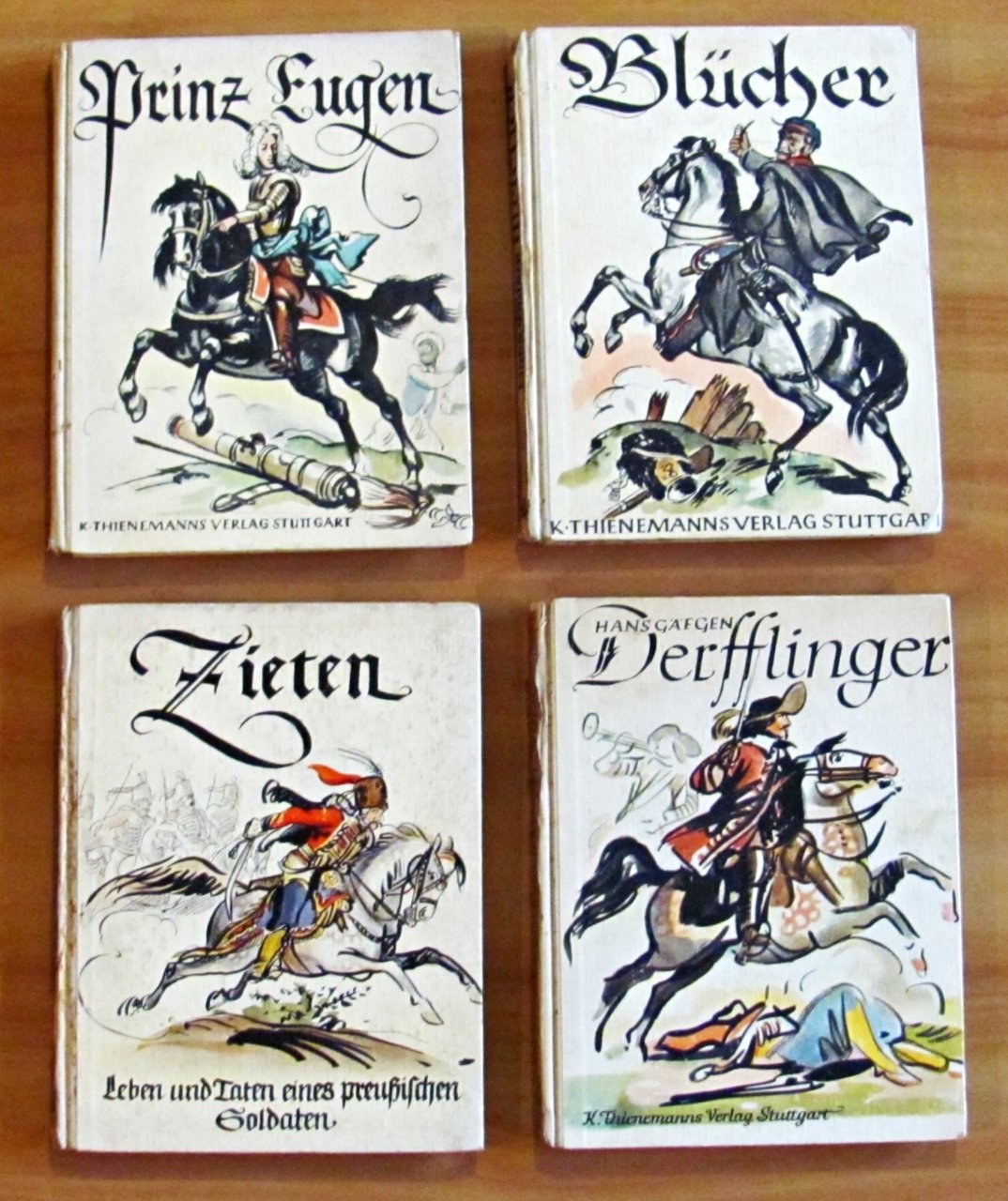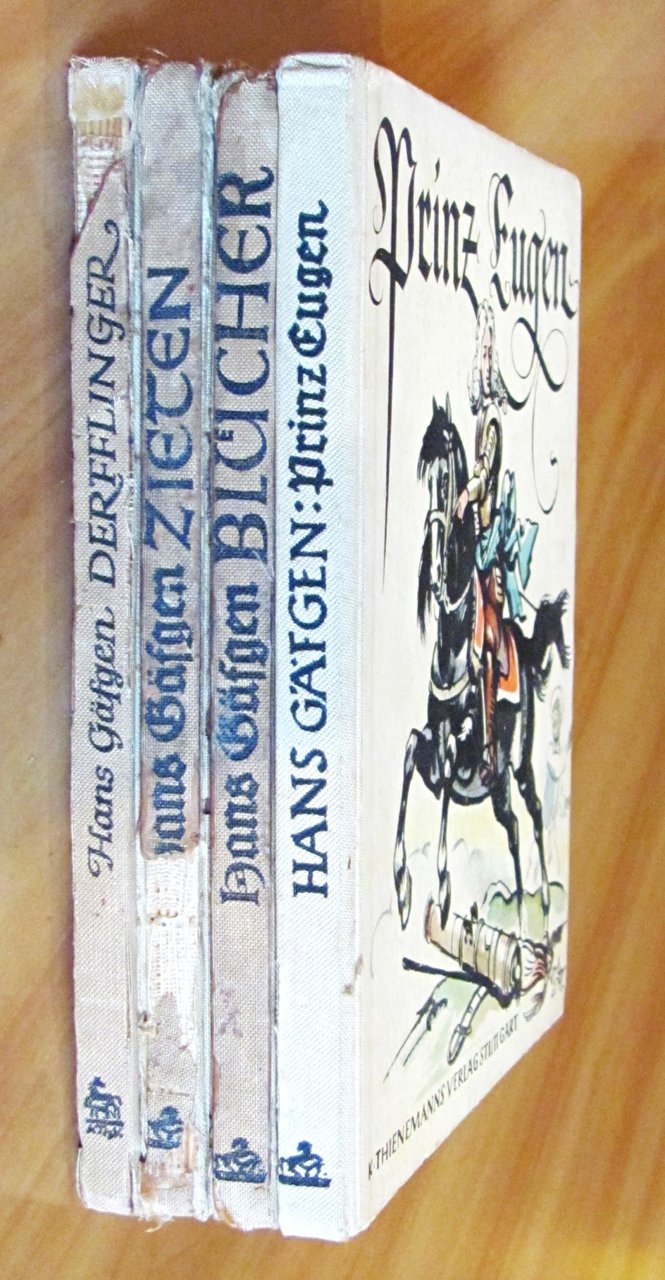 Molte illustrazioni in b/n n.t. di Gerhard Ellrich al primo e al terzo titolo, e di Fritz Kredel al secondo e quarto titolo. Blucher ha anche 4 cartine in b/n n.t. di Karl Vollmer. Ed. Thienemanns - Stuttgart, 1940. Cartonati editoriali con dorsi in tela. Zieten ha una mancanza alla parte inferiore del dorso. Derfflinger ha una piccola mancanza alla parte superiore del dorso e una dedica del tempo in antiporta. 15,5x20; pp.84, 80, 80, 82. RARI e in BUONISSIMO STATO , Molto buono (Very Good)